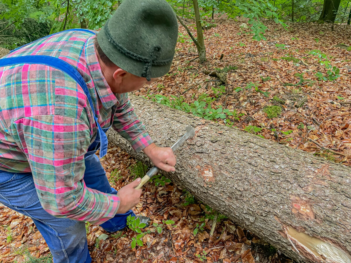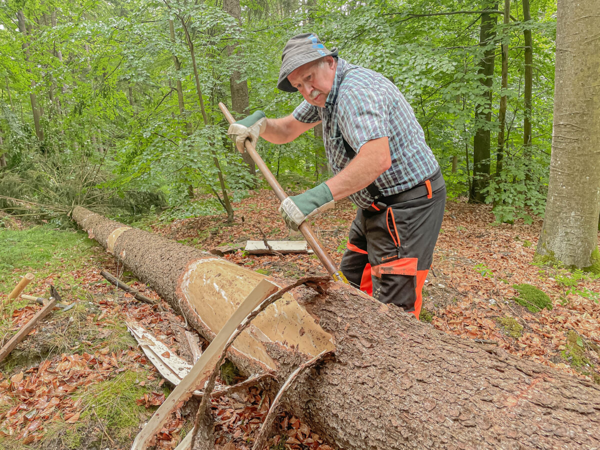 Die nächste Herausforderung war das Entrinden der Stämme mit dem sogenannten Schäleisen. „Das ist eine Kunst für sich“, sagt Arnold und demonstriert mit geübter Bewegung, wie man das Eisen mit dem ganzen Oberkörper führt. „Wenn du nur mit den Armen arbeitest, bist nach zehn Minuten fertig – und zwar nicht mit dem Stamm, sondern mit den Kräften.“ Er erinnert sich: „Mein Vater war Holzhauer, der hat das ein Leben lang gemacht. Die Alten haben zwei oder drei Kubikmeter pro Stunde geschafft – vorausgesetzt, das Holz war frisch und nicht zu harzig.“