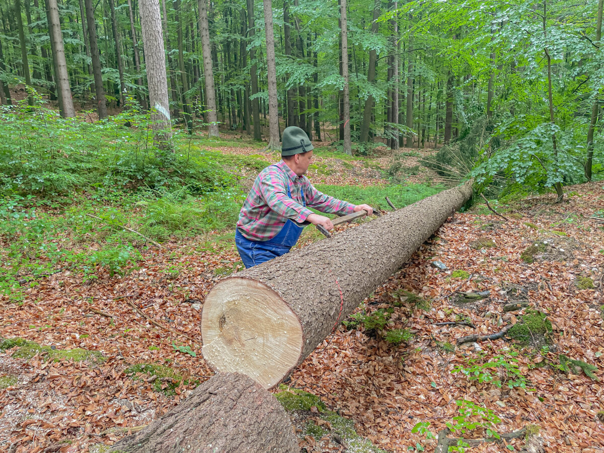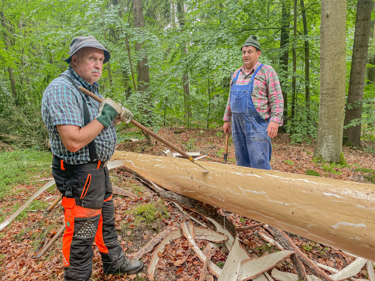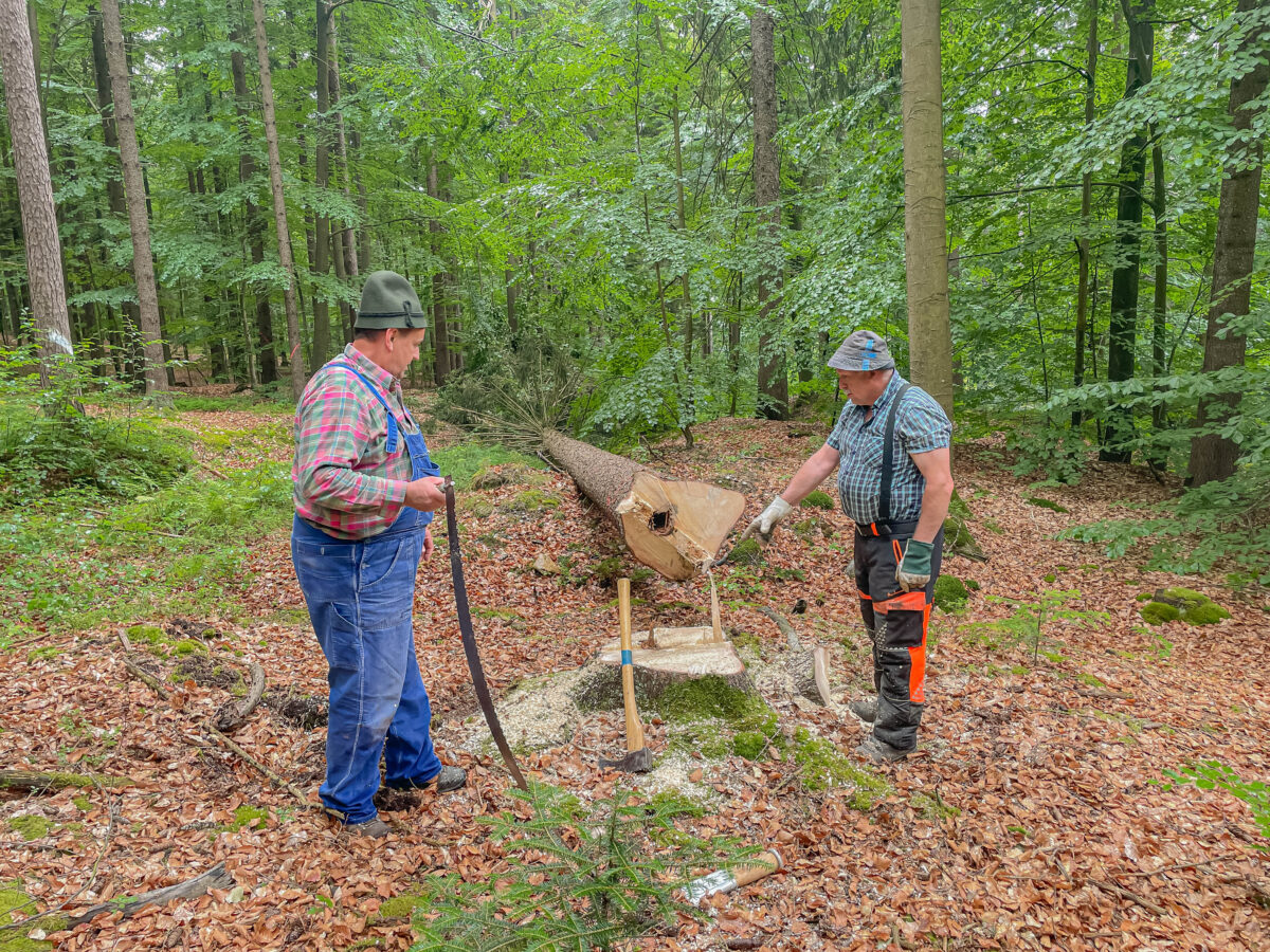 Unterstützt wurden sie auch von Lukas Reindl, der interessiert zuschaute, was der Vater an altem Handwerk zeigte. Der Baum, eine ausgewachsene Fichte, wurde in traditioneller Weise gefällt. „Das ist brutal anstrengend, wenn man’s nicht regelmäßig macht“, lacht Reindl. „Und wenn die Säge nicht richtig schneidet, stehst bald auf.“ Der Fall des Baumes war der Auftakt für ein längeres Werk aus Entasten, Ablängen und Entrinden. Ganz wie früher – nur ohne, dass jemand im Akkord dafür bezahlt wird.