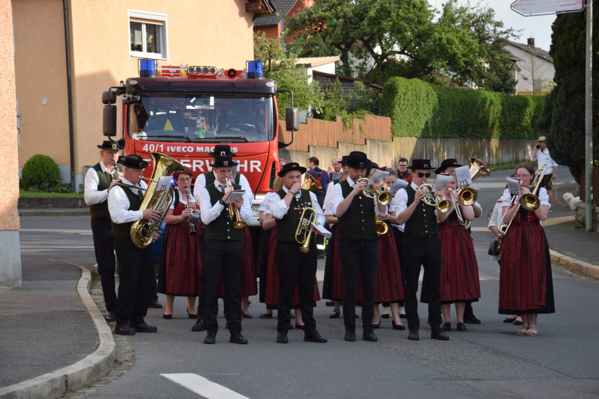 Pfarrer Norbert Götz sprach das „Vater unser“, verbunden mit dem „Gegrüßet seist du Maria“. Thomas Riedl (Firma Holzbau Riedl) hatte anschließend mit dem Kran den Maibaum rasch aufgestellt. Die Trachtenkapelle Waldthurn begleitete die Aktion mit bayerisch-böhmischen Musikstücken. Nach getaner Arbeit wurden in Windeseile Tische und Bänke aufgebaut. Viele Besucher saßen an diesem Abend noch lange zusammen, genossen den lauen Frühlingsabend und ließen sich ein kühles Getränk und leckere Bratwurstsemmeln schmecken.