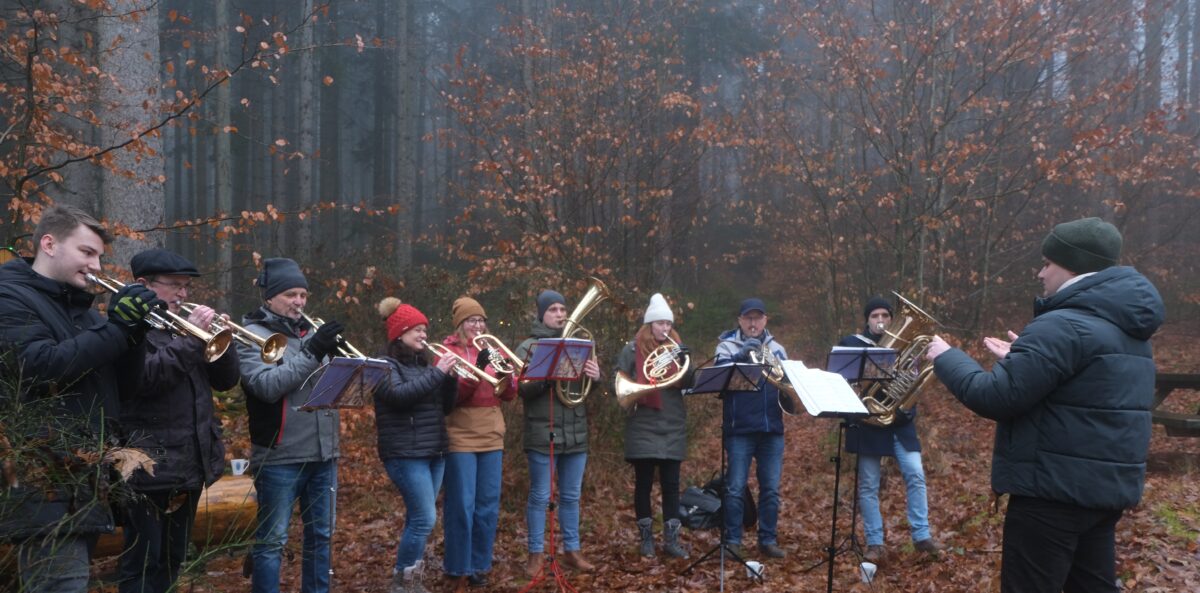 Die Wandergruppe von Floß über den Ortsteil Ziegelhütte entlang der Straße zur Kalkhütte wurde bereits beim Anmarsch von einer Bläsergruppe des evangelischen Posaunenchores unter der Leitung von David Meierhöfer mit weihnachtlichen Klängen begrüßt. Töne, die zum Mitsingen und Mitsummen einluden. Das helle Lagerfeuer, der mit Lichtern und Sternen geschmückte Christbaum und die leuchtende Umgebung vermittelten ein prächtiges Weihnachtsbild, auch ohne Schnee, dafür aber mit sehr viel dichtem Nebel.