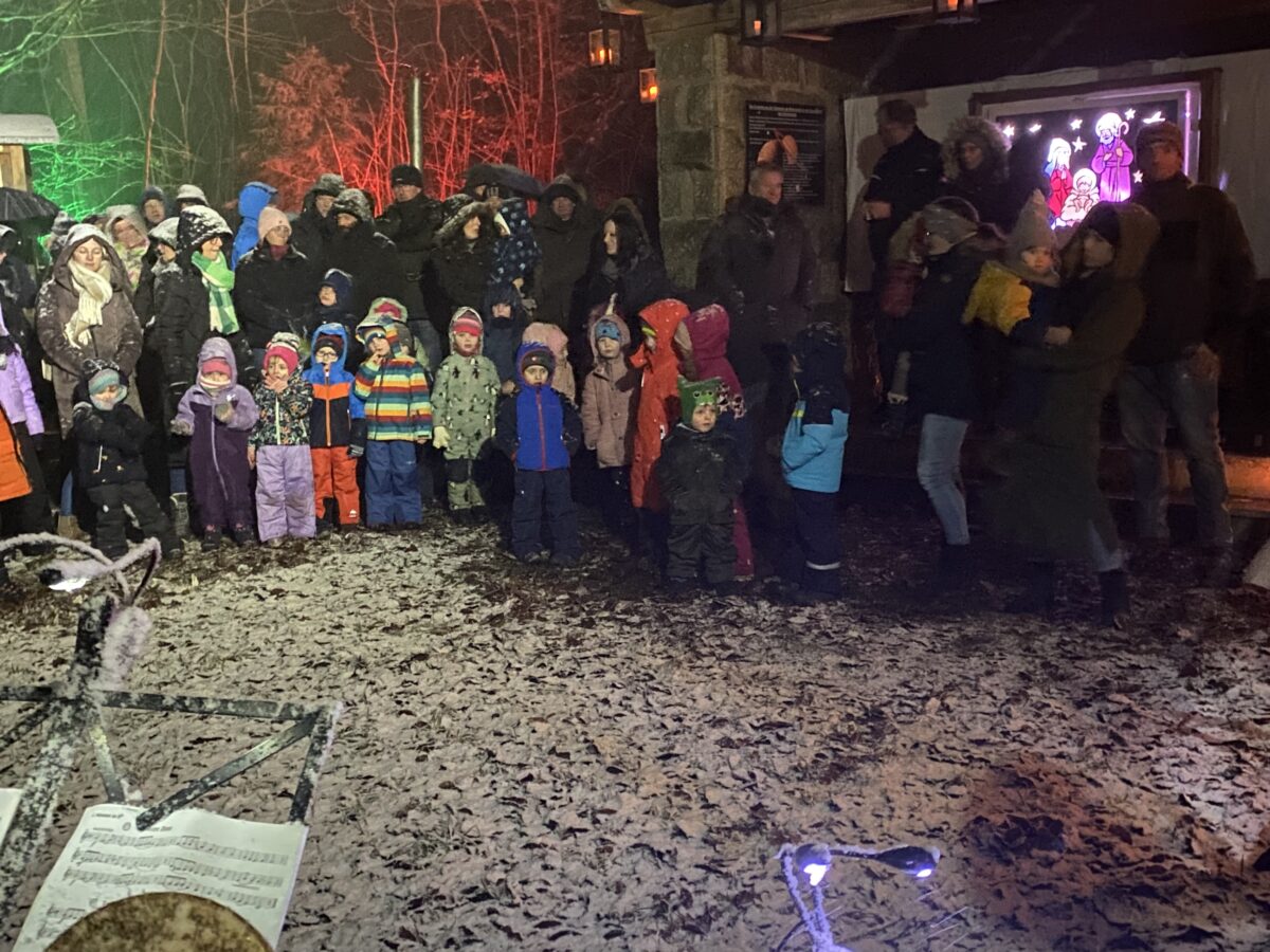 Mit weihnachtlichen Klängen eröffnete am späten Sonntagnachmittag vor den Feiertagen die Bläsergruppe „Bayrisch Blech“ am Eingang des Geologischen Lehrpfades die Waldweihnacht des OWV Tännesberg, bei der Vorstand Richard Schneider viele Besucher begrüßen konnte. Eine Feuerstelle und entsprechende Lichterdekoration erhellte die nächtliche Dunkelheit. Eingerahmt von mächtigen Bäumen, sang der Chor des katholischen Kindergarten „St. Martin“ unter der Leitung von Manuela Hinkel paßend das traditionelle Weihnachtslied „O Tannenbaum, O Tannenbaum, wie grün sind deine Blätter“.