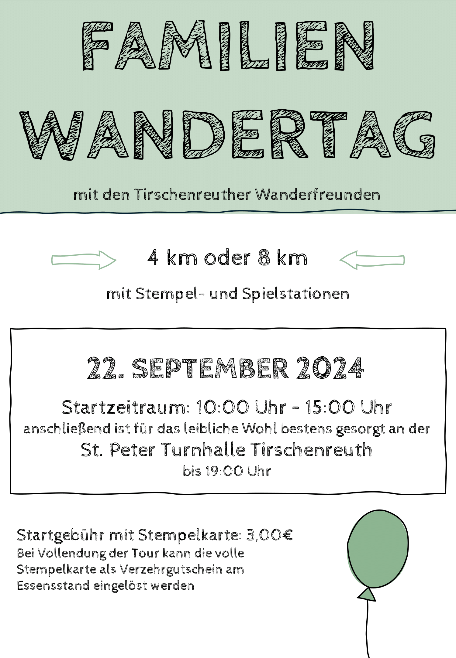 Die Wanderfreunde Tirschenreuth e.V. laden am Sonntag, den 22. September 2024, zu einem Familienwandertag in Tirschenreuth ein. Die Veranstaltung, die nach langer Zeit wieder aufgenommen wird, verspricht ein abwechslungsreiches Programm für Groß und Klein.