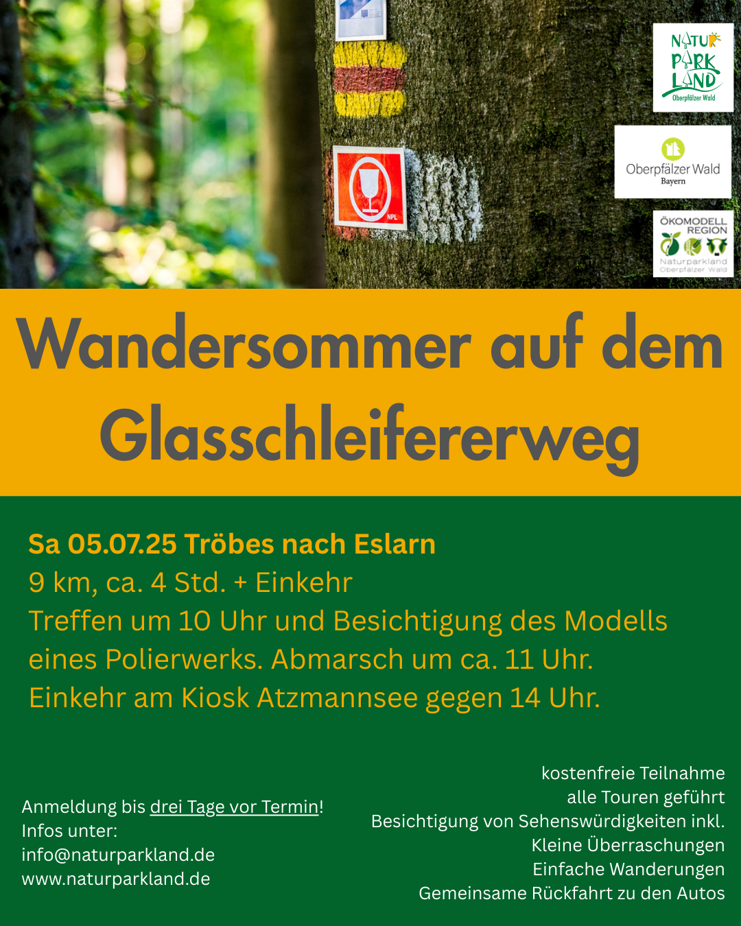 Im Rahmen des Wandersommers finden auch geführte Wanderungen statt, die den Teilnehmern die Möglichkeit bieten, den Glasschleifererweg und seine Sehenswürdigkeiten zu erleben. Die Teilnahme ist kostenfrei und die Eintrittspreise für Sehenswürdigkeiten sind inklusive. Die Teilnehmer erwarten zudem kleine Überraschungen, wie beispielsweise von der Öko-Modellregion.