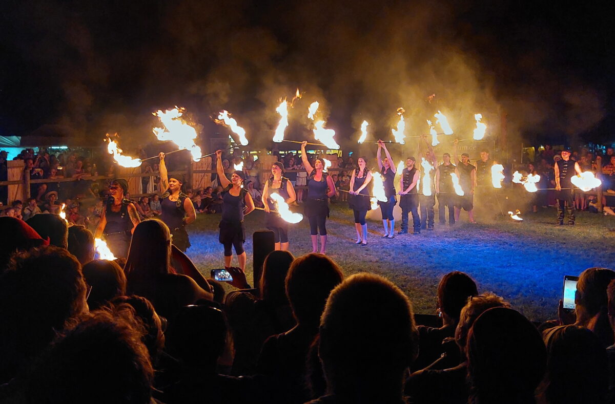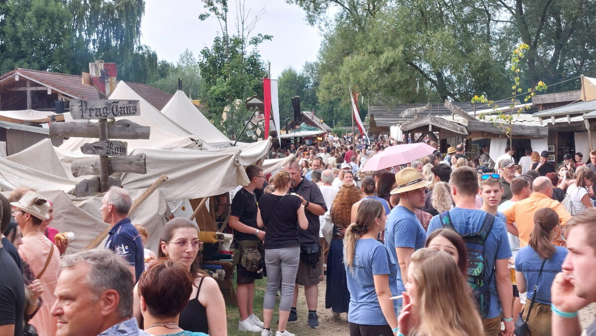 Nur wenige Schritte vom Festspiel entfernt öffnet sich eine andere Zeitreise: Beim Mittelaltermarkt „Cave Gladium“ schlagen Ritter, Handwerker und Gaukler ihre Zelte auf. Über 80 Gruppen verwandeln die Chambauen in ein riesiges Heerlager. Kinder drehen ihre Runden auf mittelalterlichen Karussells, Spielleute lassen alte Weisen erklingen, Händler bieten Schmuck, Stoffe und Waffen an. Feuertänzer lassen die Nacht erhellen.