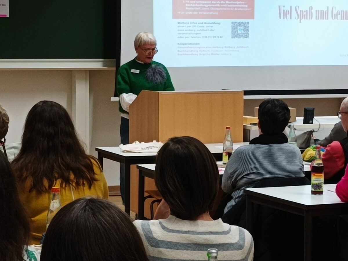 Nach der Pause mit kleinen Snacks und Getränken verteilten sich die Anwesenden auf drei Workshops, in denen praktische und intensivere Aspekte im Rahmen der Wechseljahre besprochen, ausprobiert und veranschaulicht wurden: „Angepasst essen – praktische Tipps für den Alltag“, in dem Johanna Baumann die Inhalte ihres Vortrags vertiefte; „Worte für Wandel – Frauengesundheit im Dialog“, geleitet von der systemischen Paar- und Familientherapeutin Simone Prechtl; sowie „Fit und entspannt durch die Wechseljahre – Beckenbodengymnastik und Faszientraining“, mit Beate Kiefl, lizenzierte Übungsleiterin für Breitensport.