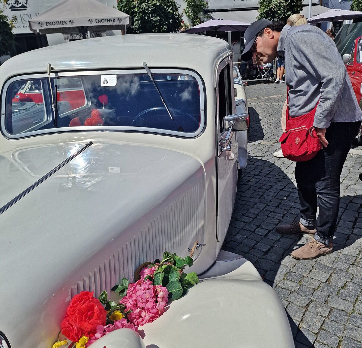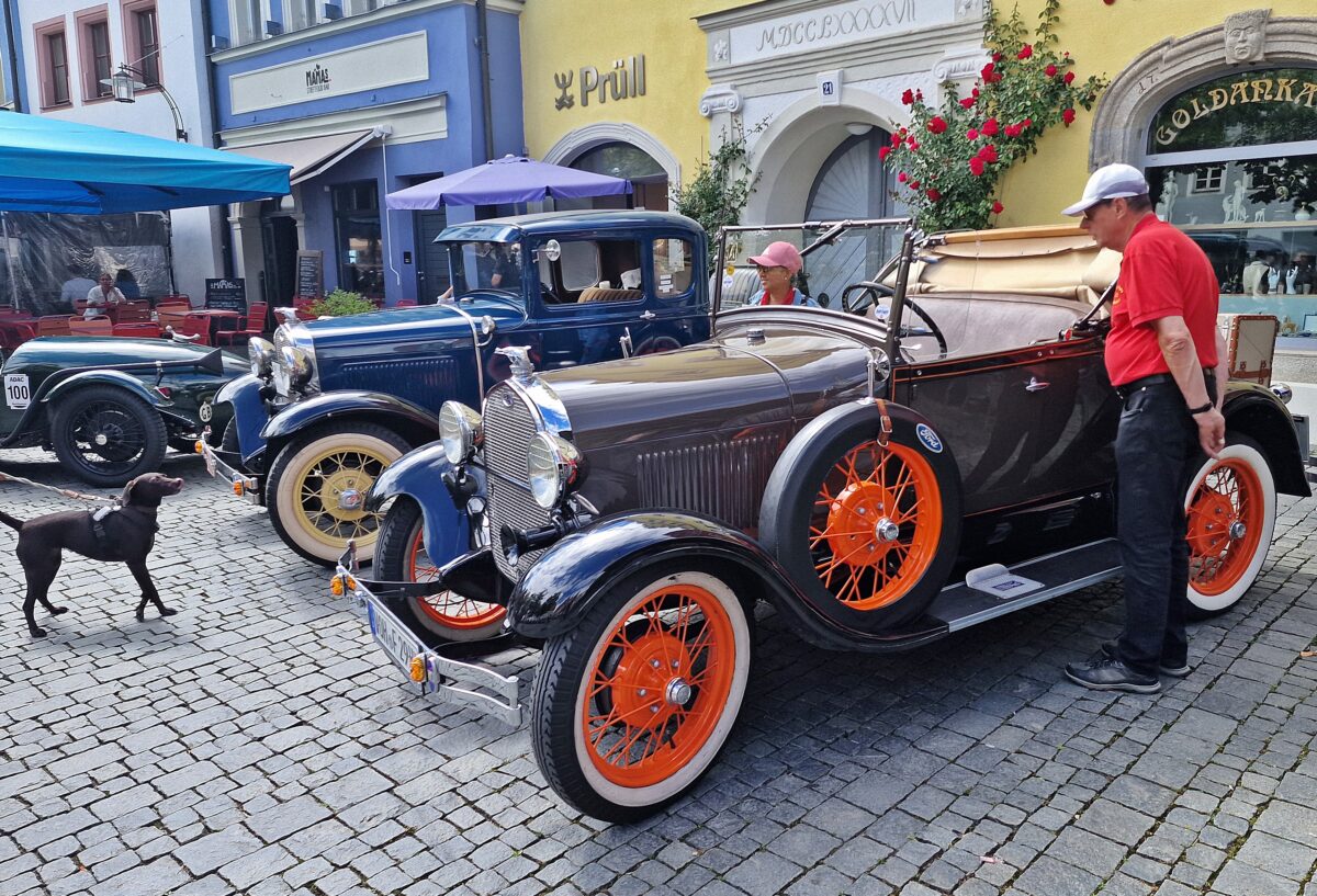 Nach dem Mittagessen führte die Polizei die Fahrzeuge in einem Autokorso durch die Frauenrichterstraße zur Altstadt. Alle Farben und Automarken waren vertreten, vom teuren Porsche bis zum Opel P4 und Ford Model A aus den Zwanzigern. Dort kam die Weidener Bevölkerung bei herrlichem Sonnenschein mit den Fahrzeugführern und Besitzern auch verbal in Kontakt, die gerne Alter, Motorstärke und Kosten bekannt gaben. Da stand am Mauermannbrunnen der Ford A von 1929 als ältestes Fahrzeug am Ort, ein Roadster Coupe mit 40 PS und 3,3 Liter Hubraum von L. Eger.