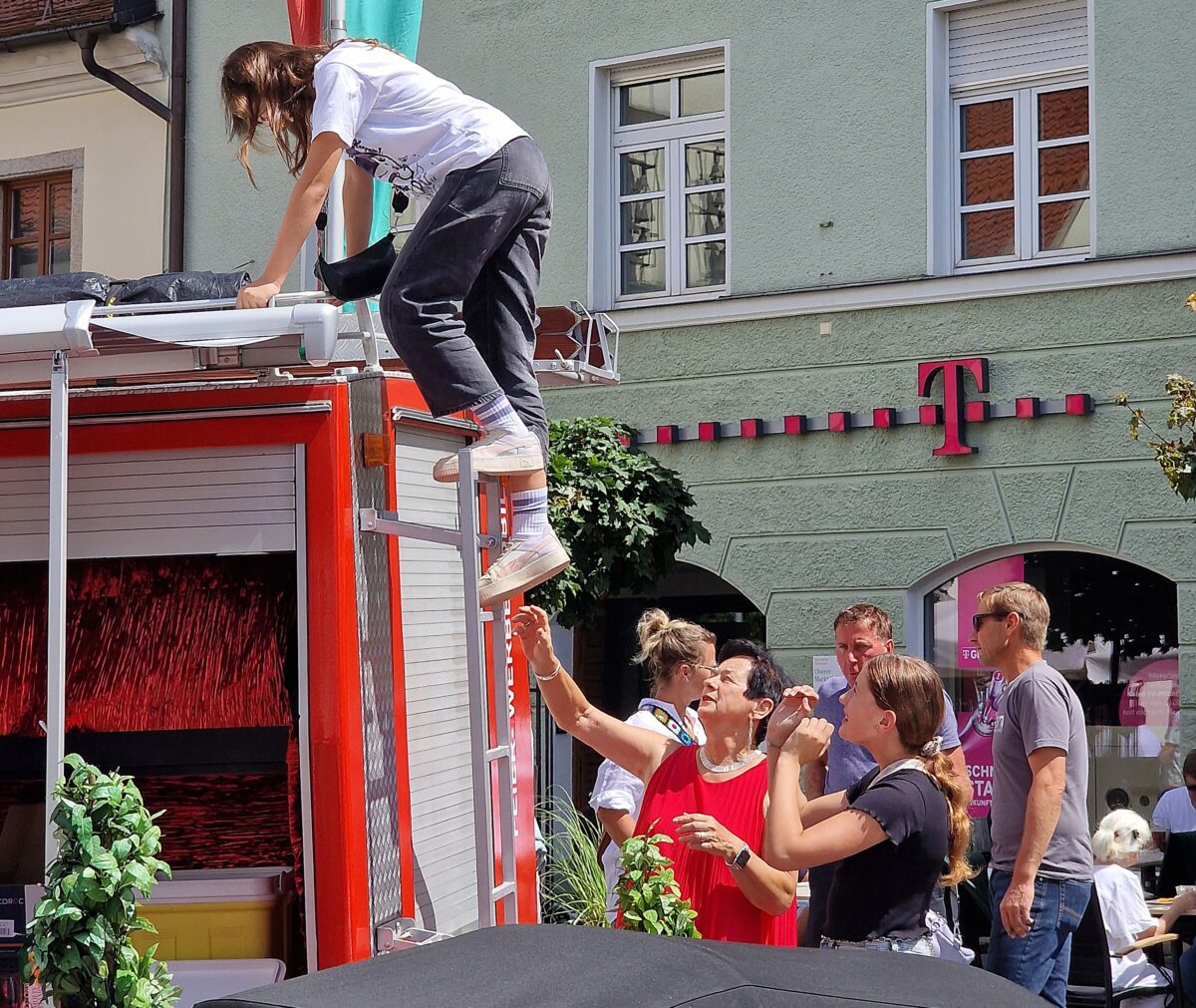 Zwei Mädels wollten unbedingt in die luftige Höhe eines Feuerwehrautos. Juan Vilas aus Neustadt hatte sich den ausrangierten LF 8 409G mit dem Baujahr 1978 aus Privatbesitz 2007 aus Kiel geholt. In mühevoller Kleinarbeit baute der jetzige Besitzer ihn zum „Feiermobil“ um. Seit 2021 als Oldtimer bestätigt, weil er nahezu im Originalzustand Interessenten auch für viele Events zur Verfügung steht. Er hat 90 PS und 2277 Hub und verwandelt sich gerne in einen Ergebnisstand.