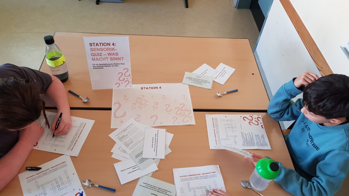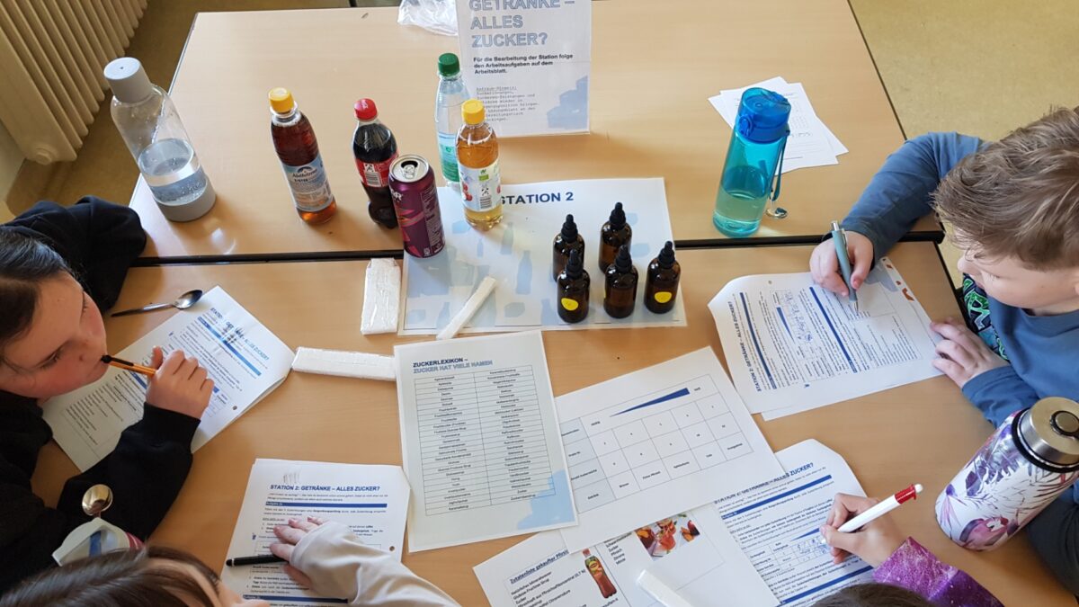 So erfuhren die Kinder nicht nur, wie unterschiedlich sich Apfelsorten anfühlen und schmecken können, sondern auch, dass der Geschmack nicht vom Aussehen des Obstes abhängig ist. In diesem Zusammenhang wurde die Herkunft und Saisonabhängigkeit von Lebensmittel thematisiert. Besonders spannend für die Jugendlichen war der „Zucker-Check“. Hier verkosteten sie unterschiedlich stark gesüßte Lösungen und ordneten diese entsprechend ihrer Zuckerkonzentration allseits beliebten Getränken zu. Dabei lernten sie, dass bereits das gezielte Lesen der Zutatenliste beim Einkauf für eine gesundheitsförderliche Entscheidung wichtig ist, gerade in Zeiten steigender Zuckeraufnahme bei jungen Menschen. Wie sehr die Farbe eines Joghurts unseren Geschmack beeinflusst, konnten die Teilnehmer in einer weiteren Station erfahren. Ergänzt wurde das Angebot durch ein unterhaltsames Sensorik-Quiz, das das erworbene Wissen aufgriff und vertiefte.