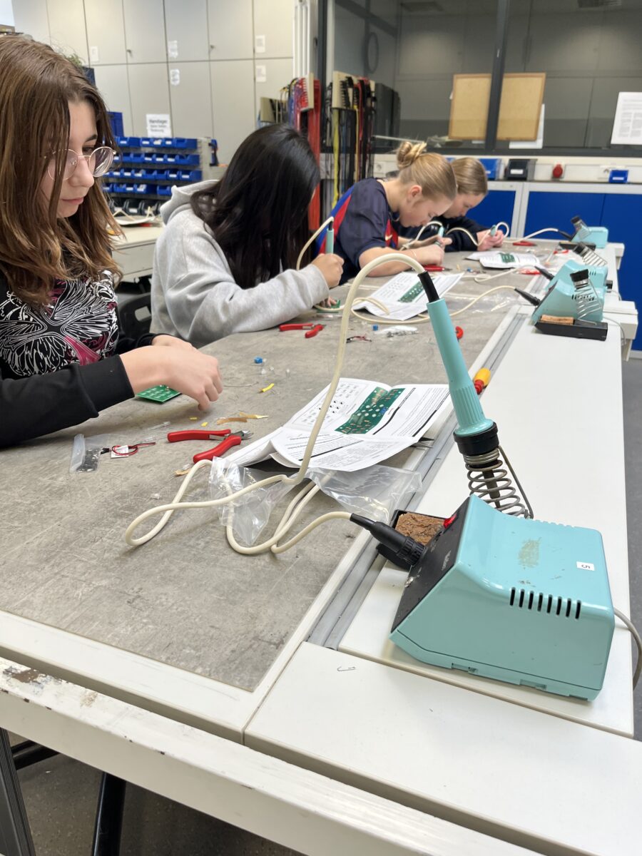 Die Schülerinnen konnten zwischen sechs Praxisstationen wählen, wobei sie zwei davon im Rahmen ihres Praxistags besuchten. Bei den Elektrikern löteten sie ein kleines Tic-Tac-Toe Spiel, in der Kfz-Werkstatt erkundeten sie, wie man Marderschäden erkennt und repariert. Einen kleinen Flaschenöffner fertigten sie bei den Metallbauern an und lernten die Verbindung zwischen Handwerk und Mathematik bei der Erstellung eines Dachstuhls und in der Bauhalle bei Messübungen kennen. „Macht Spaß“, sagt Leni Eisenreich, eine 14-jährige Schülerin aus Oberwildenau und war vom Löten besonders angetan, während Sophie Tretter, 13 Jahre alt, aus Luhe, die Holzarbeiten favorisierte und vor allem die Vielseitigkeit des Handwerks lobte.