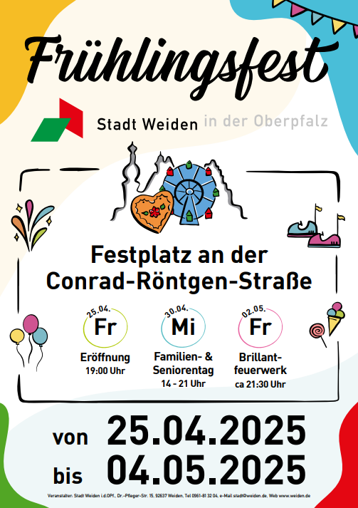Die Stadt Weiden ist wieder Gastgeberin des traditionellen Frühlingsfestes. Vom 25. April bis zum 4. Mai 2025 öffnet das 87. Frühlingsfest seine Pforten auf dem Festplatz an der Conrad-Röntgen-Straße. Die Eröffnung findet um 18:30 Uhr mit einem Festzug statt, gefolgt von dem Bieranstich durch Oberbürgermeister Jens Meyer um 19 Uhr. Musikalisch wird der Auftakt von der Spitzen-Band Bayernmän gestaltet, die bereits auf dem Münchner Oktoberfest für Stimmung sorgte.