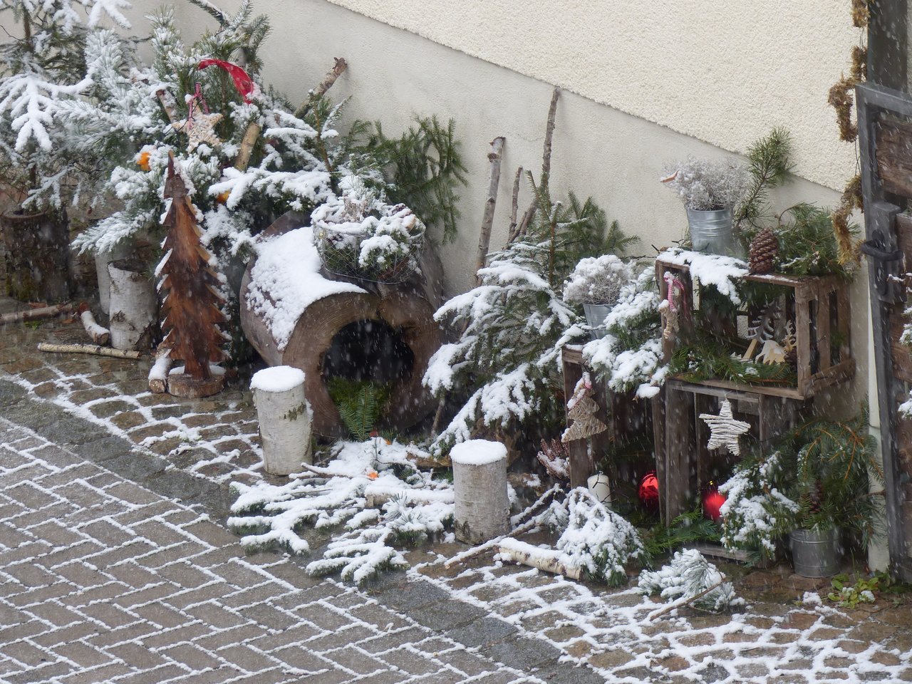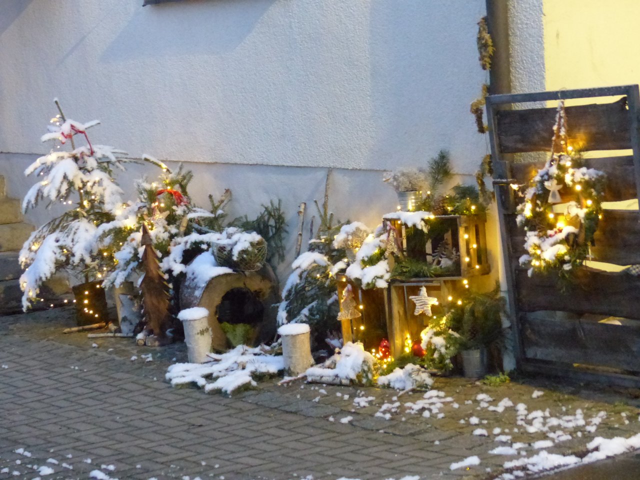 Man kann es sich gar nicht schöner wünschen, als dass am ersten Adventssonntag die ersten Schneeflocken die Landschaft verzaubern. Auch die vorweihnachtlichen Dekorationen an Häusern tragen zur Weihnachtsstimmung bei, wie die von Renate Birner. Sie hat abermals keine Mühe gescheut bei der Ausschmückung ihres Eingangs mit Streu, Holz, Kerzen, Kugeln und allem, was zur Weihnachtszeit gehört.