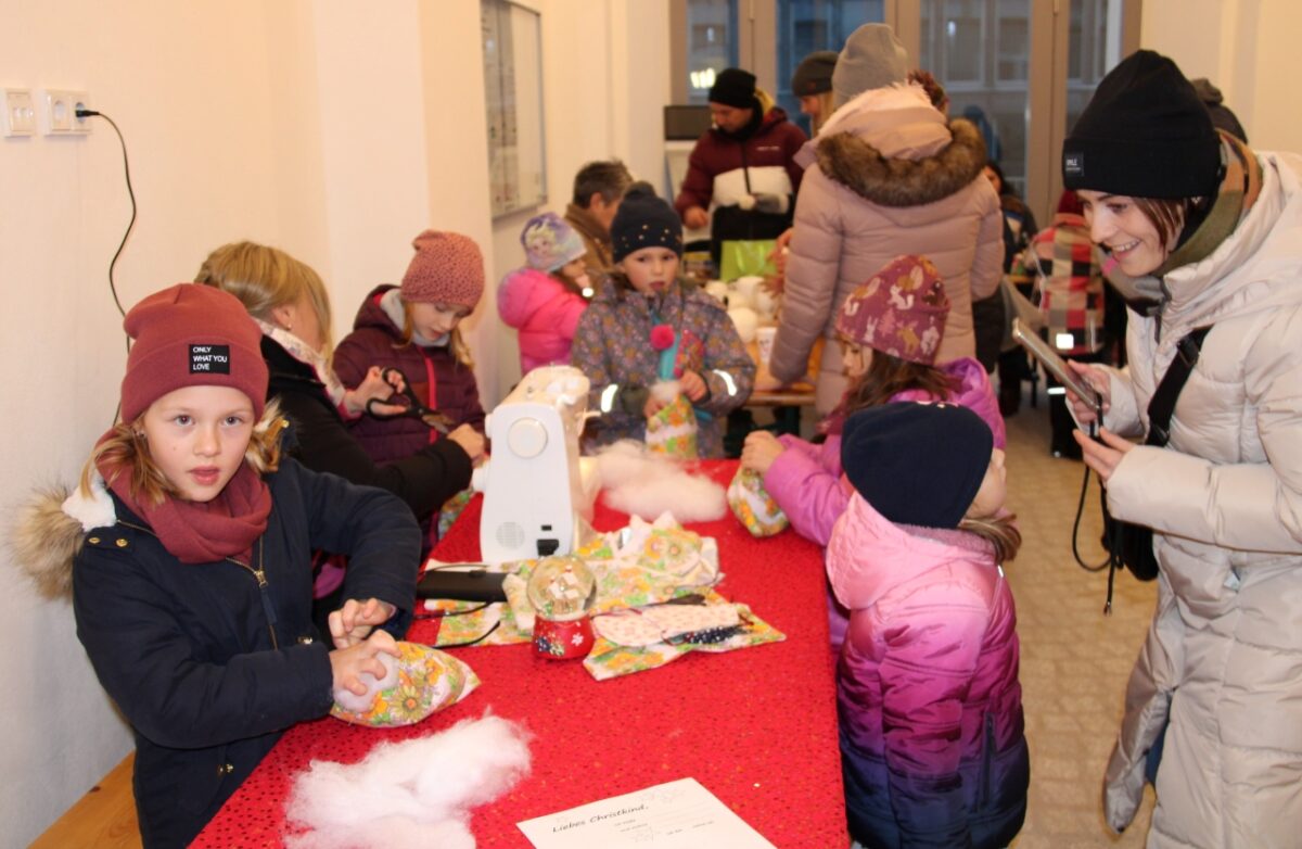 Die Kinder durften im Hutza-Zimmer im Eingangsbereich des Landratsamts mit Puppen spielen, nähen und basteln oder dem Christkind einen Brief mit ihren Wünschen schreiben. Einige Buden boten selbst gebastelte Weihnachtsdekoration an. Gegen Hunger und Durst halfen die Hütten mit Kartoffelsuppe, Bratwürsten vom Rost, Schokofrüchten, frisch gebackenen Waffeln, Glühwein oder Kinderpunsch. Ab 16 Uhr war allerdings angesichts des großen Besucheransturms Geduld beim Anstehen um Glühwein und Bratwurst gefragt.