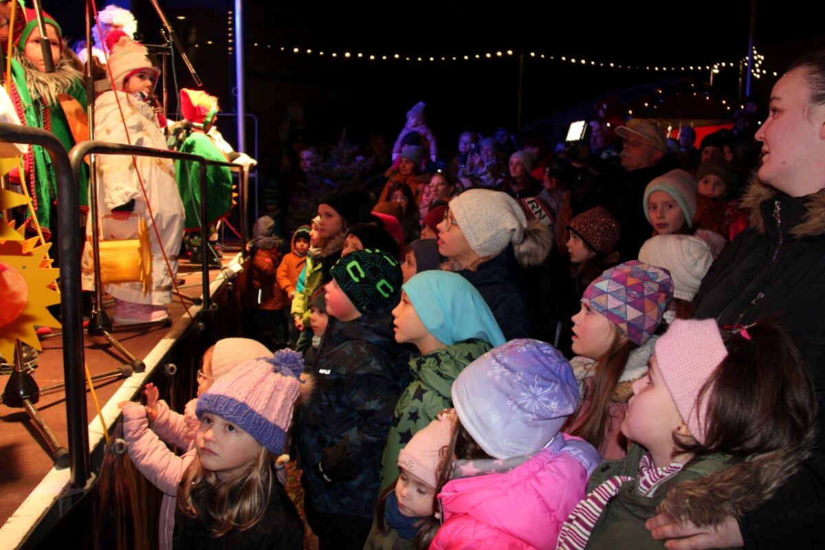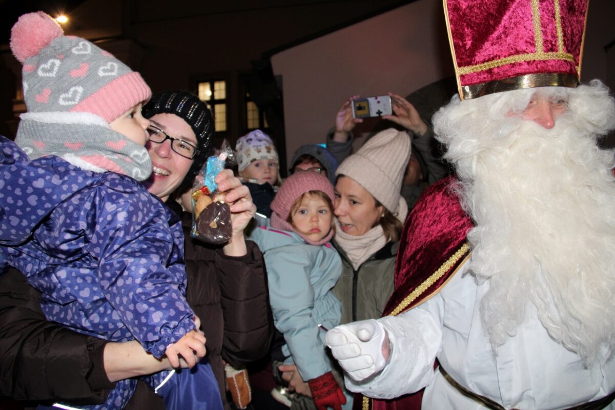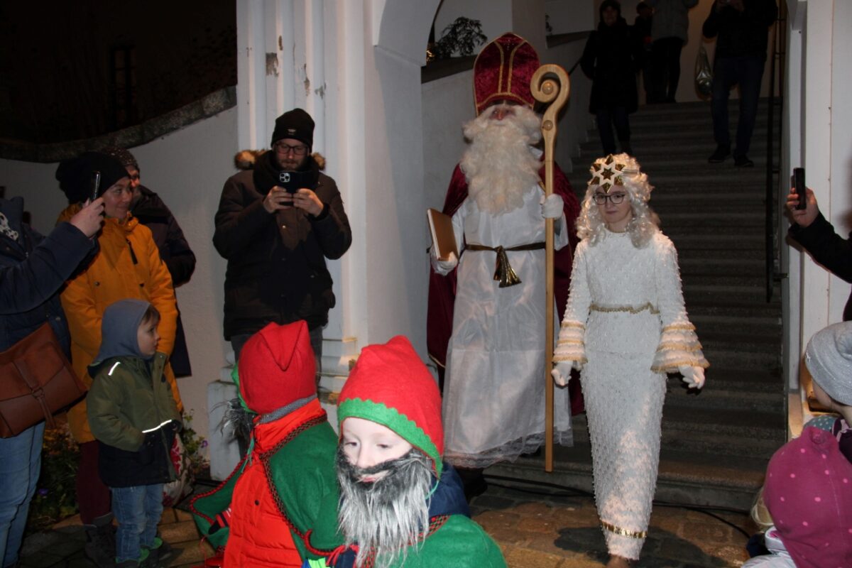 Groß wurden die Augen der Kinder als nach Einbruch der Dunkelheit die Christbaum- und weihnachtliche Stadtplatzbeleuchtung eingeschaltet wurden und das Christkind (Isabella Puff) sowie der Heilige Nikolaus (Wolfgang Huber), begleitet von Engeln und Zwergen über die Treppe des Alten Schlosses ihre Runde durch die Menschenmenge auf die Bühne drehten. Jedes Kind bekam von den Lichtgestalten ein Geschenkpäckchen überreicht. Die beiden Neustädter Nachtwächter Thomas und Jakob Schuster setzten schließlich gegen 18 Uhr den Schlusspunkt unter die gelungene Veranstaltung.