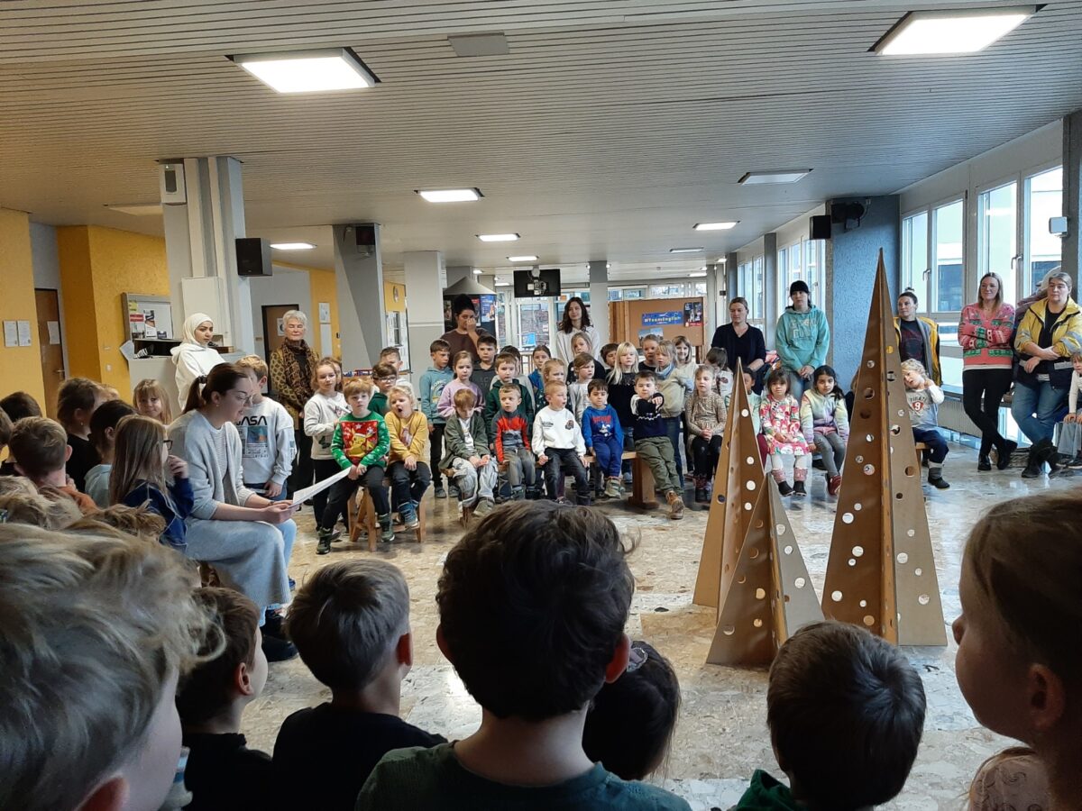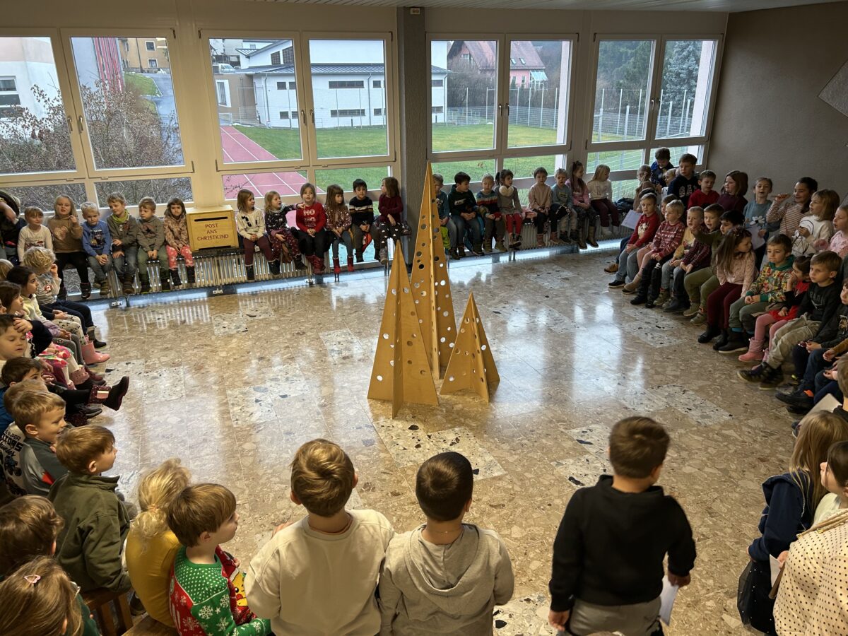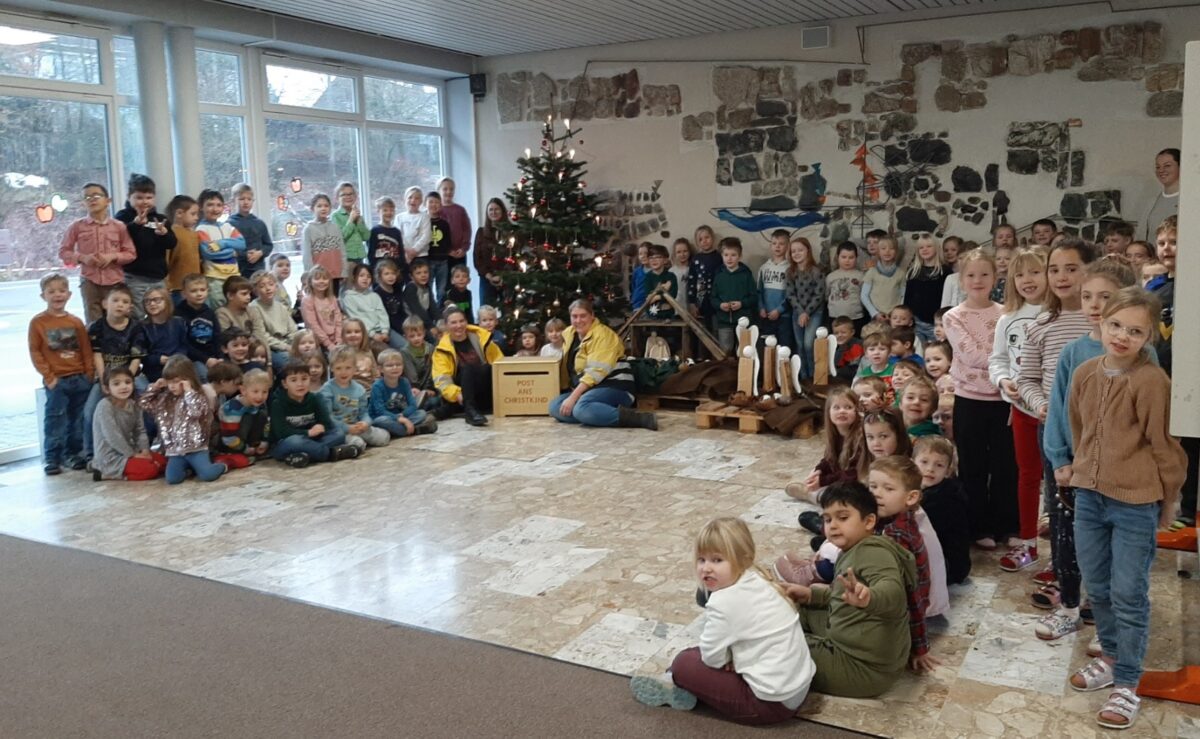 Am 1. Dezember hatten die FleGS-Klassen die Vorschulkinder zu einer gemeinsamen Adventsfeier in die weihnachtlich geschmückte Aula eingeladen. Zwei Postfrauen des Kindergartens „Sankt Elisabeth“ hatten dazu einen goldenen Briefkasten mitgebracht. Die Schulkinder brachten nach der allgemeinen Begrüßung das Lied „Lasst uns froh und munter sein“ zu Gehör, bei dem auch die kleinen Gäste begeistert mitsangen.