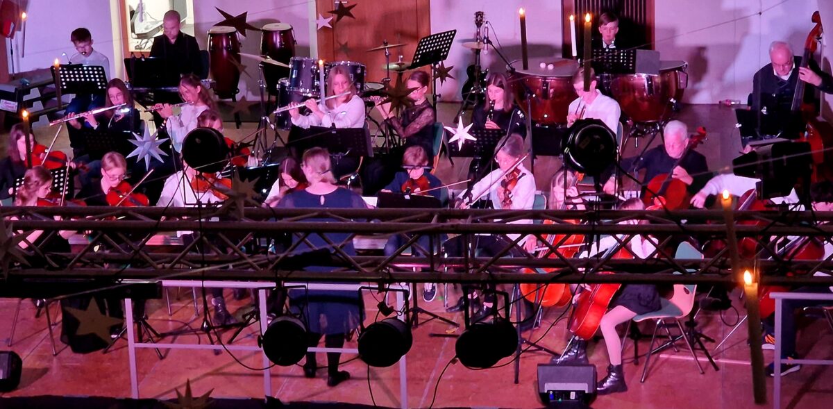 Das Orchester unter der Leitung von Marina Gmeiner eröffnete in der etwas abgedunkelten Aula mit „Wonderful Time of the Year“ und „Drei Haselnüsse für Aschenbrödel“. Voll besetzt war der große Raum, von der Empore und auf den Stufen ins Obergeschoss saßen die jungen Leute und auch die Vielzahl der jungen Musiker und Sängerinnen. Weihnachtlich wurde es mit dem Celloensemble „Es ist ein Ros entsprungen“.