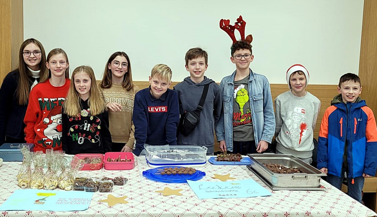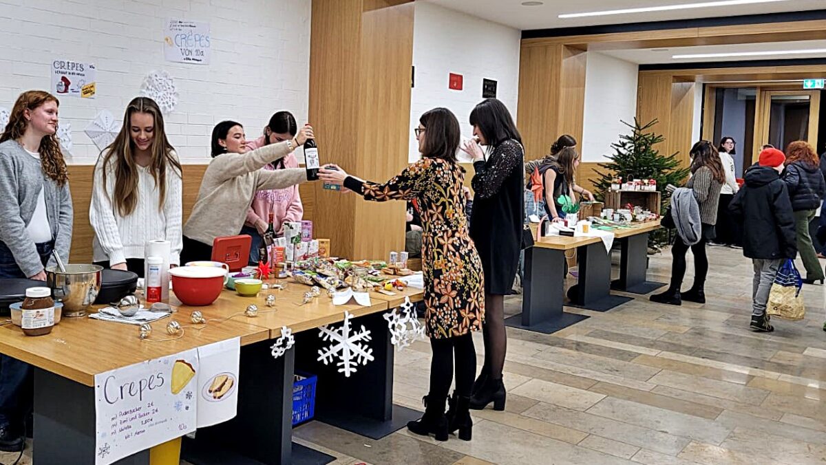 Bereits der Weihnachtsbasar war erneut ein Highlight von der 5. Klasse bis zur Zwölften. Zahlreich drängten sich die Gäste und Besucher in den Gängen und der Mensa, betrachteten Bastelarbeiten der fünften Klasse wie Sterne, Kerzen, Karten oder Baumschmuck. Die achte Klasse hatte Salzkerzen hergestellt und versteigerte gar einen Weihnachtsbaum. Weitere Klassen boten Leckerbissen von Fruchtspießen, Crêpes und Waffeln an. Die Zwölftklässler kochten Kürbissuppe, der Elternbeirat mit Vorsitzenden Johannes Zintl war für Getränke, Glühwein und Grillspezialitäten zuständig.