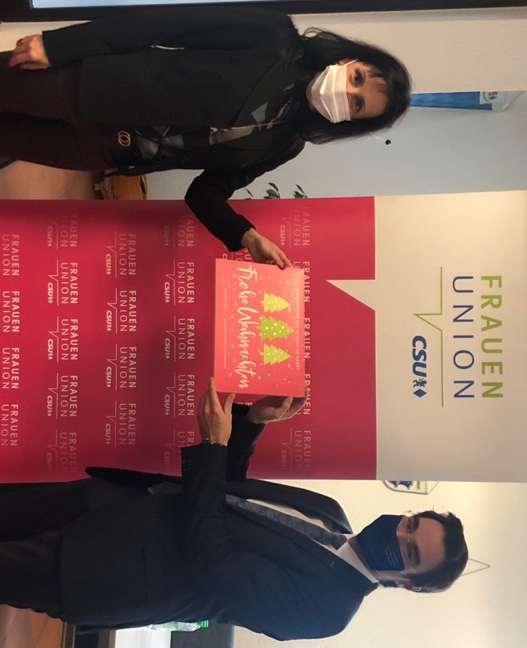Die Kreisvorsitzende Schiffmann hat sich sogar persönlich auf dem Weg gemacht, um den CSU-Kreisvorsitzenden Stephan Oetzinger den adventlichen Gruß in seinem Büro zu übergeben sowie ihrer Vorgängerin und FU-Ehrenkreisvorsitzenden Sieglinde Schärtl in Döllnitz – das alles mit Abstand und Maske.