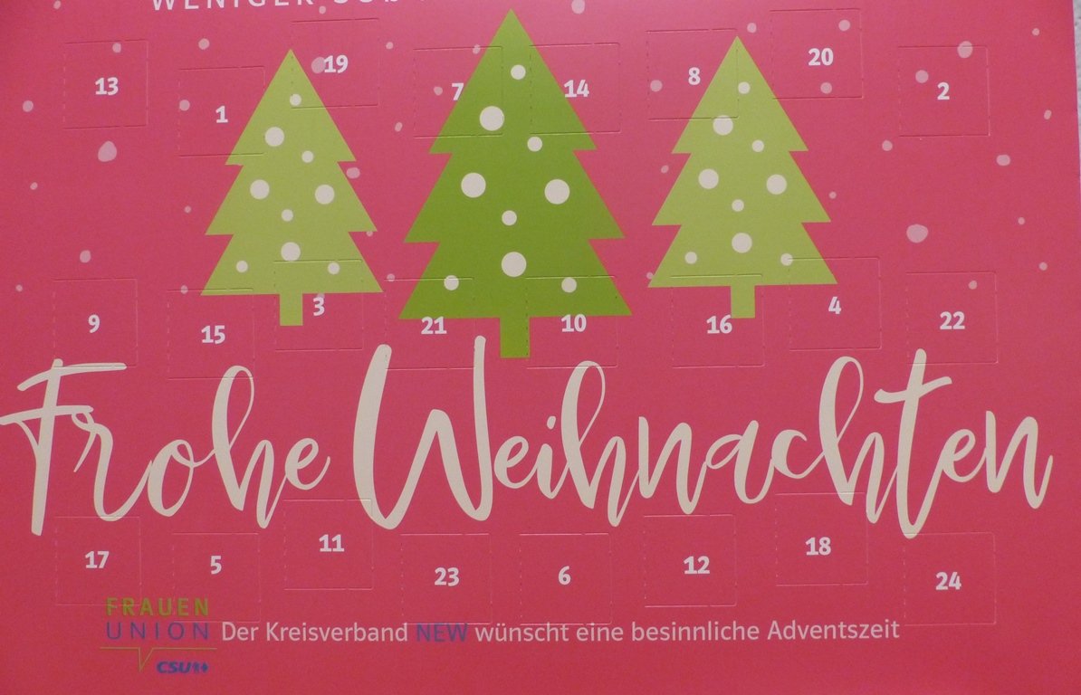 Der Kreisverband der CSU-Frauen Union (FU) hat in diesem Jahr wegen der Corona-Pandemie die gewohnten und geplanten Veranstaltungen nicht abhalten können. Dafür hat sich die Kreisvorstandschaft unter Vorsitz von FU-Kreisvorsitzender Tanja Schiffmann etwas anderes einfallen lassen: „Weniger süß als Man(n) denkt“. Schiffmann hatte die Idee einen Adventskalender umsetzen.