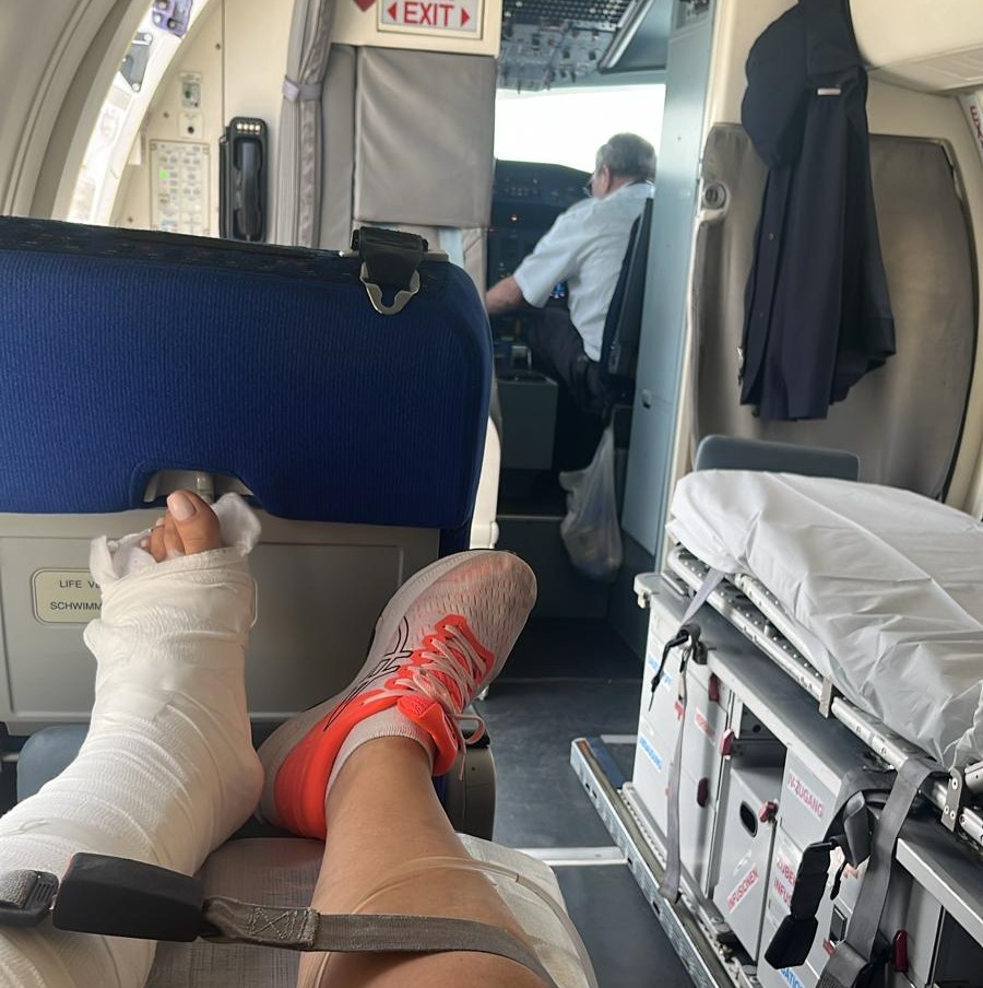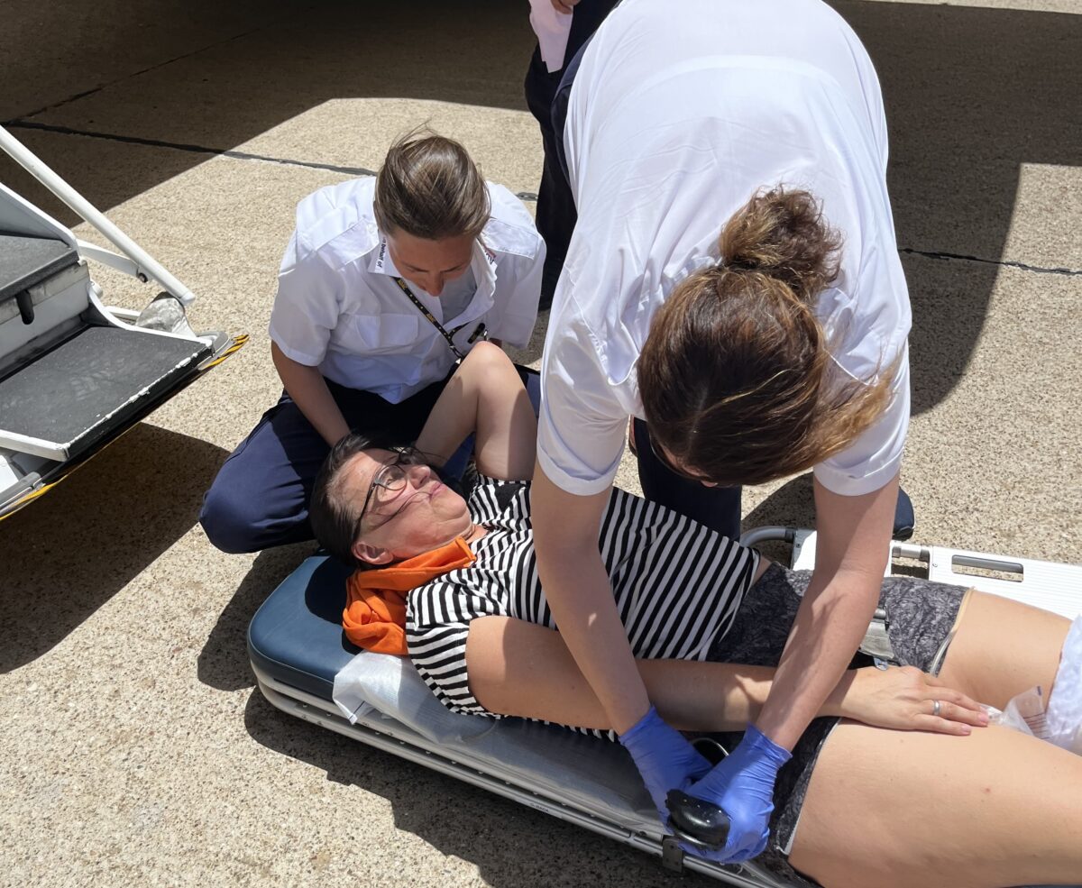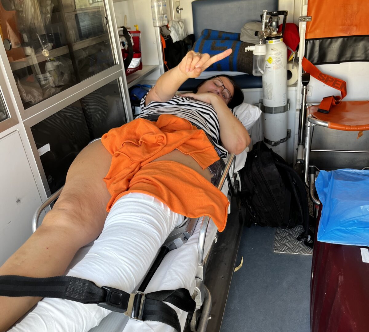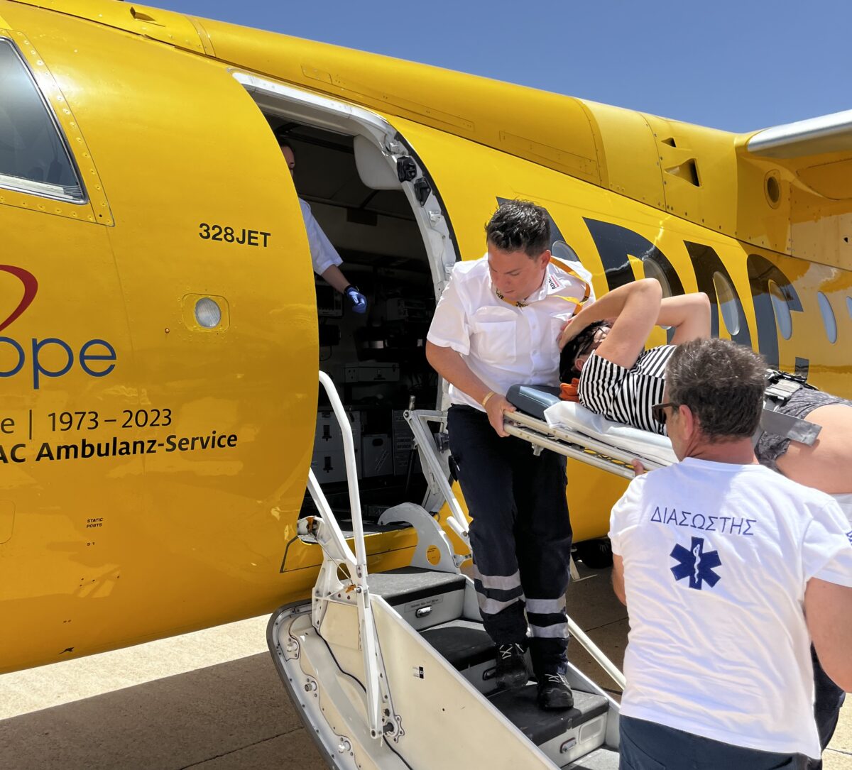 Mittwochvormittag: Vor der Zimmertür hören wir Geräusche, es klopft. Die Reinigungskraft? Nein, besser, viel besser: Draußen stehen zwei Sanitäter mit einer Trage. Ganze Felsen fallen von unseren Schultern, Karin ist den Tränen nah. Eine halbe Stunde später stehen wir mit dem Rettungswagen neben dem Rollfeld, weitere zehn Minuten später schwebt der “Gelbe ADAC-Engel” ein. Die Rettung ist da. Nach der Landung kümmern sich alle sofort liebevoll um die Verletzte: Kapitän, Arzt, Pflegepersonal. Unsere Erleichterung ist kaum zu beschreiben. Es war, als fielen Weihnachten, Neujahr, Hochzeit und alle Geburtstage zusammen. Wenn der Begriff “Gelbe Engel” auch nur einmal seine Berechtigung gehabt haben sollte, dann an diesem 5. Juni 2024.