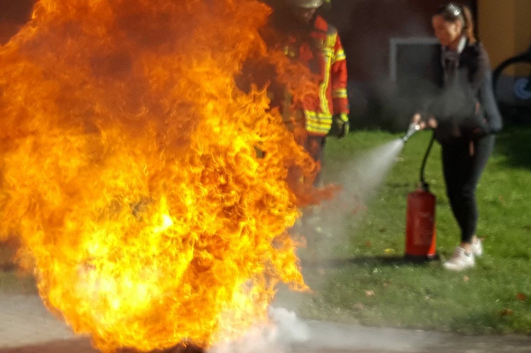 Dabei stellten sie verschiedene Situationen wie zum Beispiel Fett- und Flüssigkeitsbrände nach. Dazu verwendeten sie eine spezielle gasbetriebene Brandsimulationsanlage. Nach einer kurzen Einweisung durfte jeder Teilnehmer mit unterschiedlichen Feuerlöschern sowie mit Feuerlöschdecken trainieren, um bestmöglich in solchen Ausnahmesituation reagieren zu können.