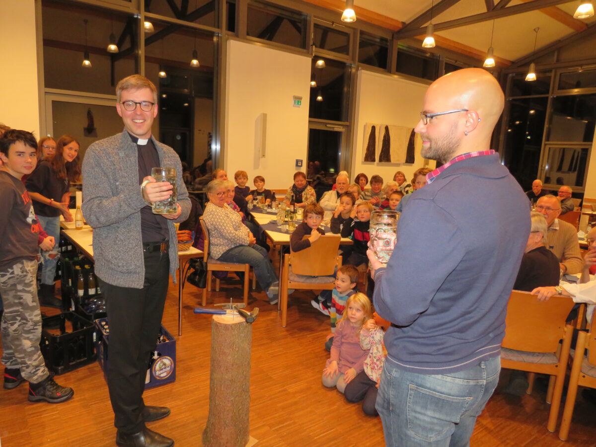 Die Ministranten sorgten mit ihrem Spiel „Wer schlägt den Pfarrer“ für Unterhaltung. Der Pfarrer Thomas Kopp musste sich gegen Freiwillige beweisen. Die Kategorien lauteten Maßkrug-Stemmen, Schnell-Nageln und verpixelten Bilder erkennen. Am Ende waren sich alle einig, dass er sich gut geschlagen habe.