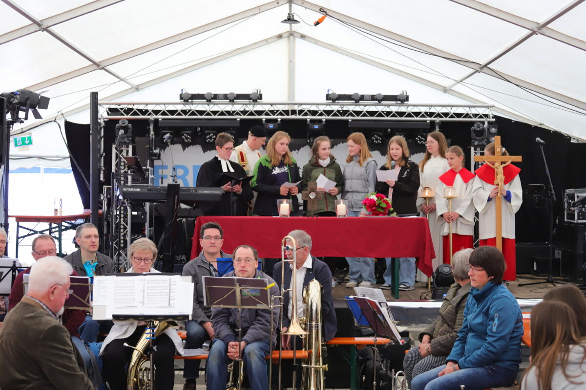 Eine adäquate, sehr besinnliche Einleitung schuf am Samstagnachmittag, der gut besuchte und von der evangelischen Pfarrerin Heidi Landgraf zusammen mit ihrem katholischen Kollegen Berthold Heller und Pastoralreferentin Andrea Zeller gestalteter ökumenische Gottesdienst im Zelt. Landgraf hatte ihre Ansprache unter den Titel „Alle sprechen eine Sprache, wenn ein Mensch den anderen liebt“ gestellt, alle Passagen befassten sich mit Varianten der Sprache und fokussierten sich auf Pfingsten als Geburtsfest der Kirche.