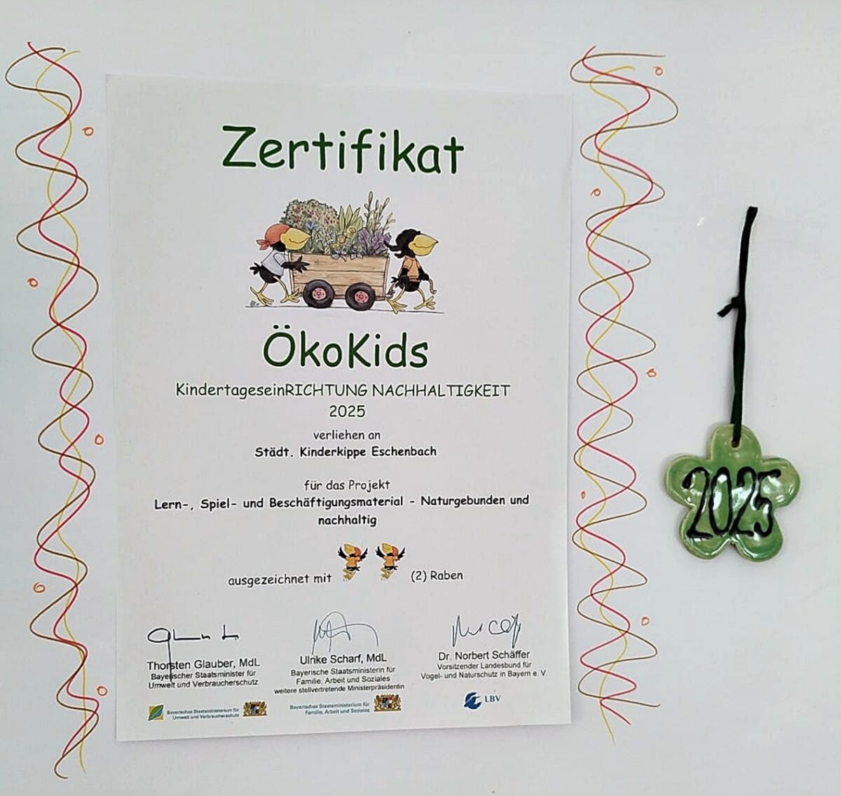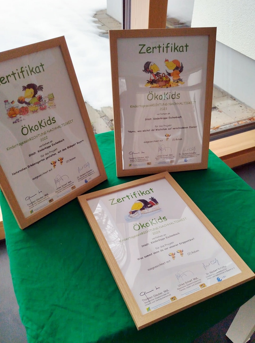 Bereits zum wiederholten Mal wurde die Einrichtung mit der Auszeichnung „ÖkoKids“ des Landesbundes für Vogel- und Naturschutz in Bayern (LBV) geehrt – nun auch für das Jahr 2025. Damit wird erneut das nachhaltige pädagogische Engagement der Kinderkrippe gewürdigt.
