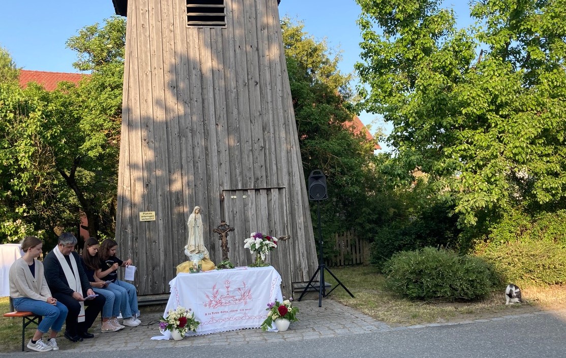 Die letzte Maiandacht fand am Pfingstsonntag in Wieselrieth statt. Am Glockenturm der kleinen Ortschaft, die zur Pfarrei St. Margareta Leuchtenberg gehört, hatten die Dorfbewohner einen Altar aufgebaut. Darauf war nicht nur das Kruzifix, sondern auch eine Statue der Madonna von Fatima aufgestellt.