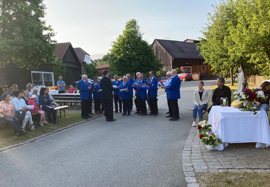 Sehr viele Gläubigen aus der Region hatten sich auf den Bierbänken zum Beten und Singen versammelt. Pfarrer Adam Nieciecki feierten mit ihnen das Marienlob und der Männergesangverein „Liederkranz“ aus Leuchtenberg mit Dirigent Holger Scheufler ließen ihr Stimmen ertönen. Nach vielem Beten und Singen wurde auch für das leibliche Wohl gesorgt, denn die Frauen des Dorfes hatten ein Essens- und Getränkebüfett vorbereitet. Gegen eine Spende konnten sich alle am Dorfplatz neben dem Glockenturm stärken und ins Gespräch kommen.