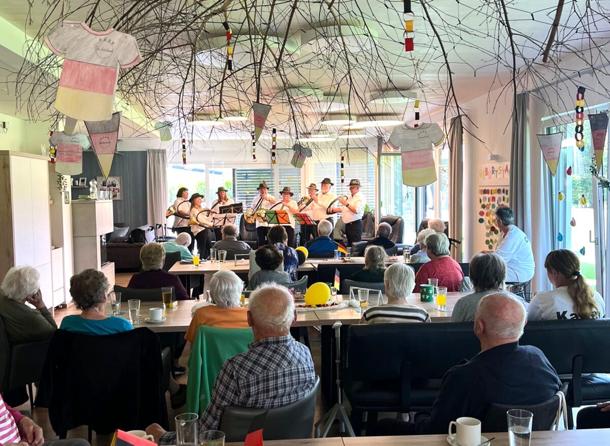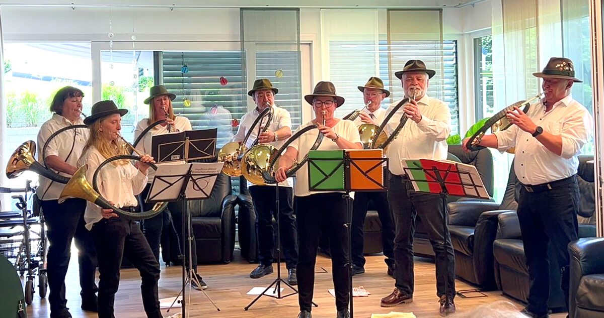 Die Jagdhornbläser aus Windischeschenbach gaben mit Blick auf den Waldthurner Badeweiher einen Einblick ihr musikalisches Können. Mit dabei und organisiert hatte dies Sabrina Kick vom Pflegedienst der Einrichtung, die Mitglied in der Gruppe ist und selbst mit musiziert hat. „Anlass unseres Auftrittes war dieser Wildtag, den wir für unsere Bewohner organisiert hatten“, erklärte Kick. Vom Gänsbürgerladen habe man Hirschsalami, -leberkäse und -leberwurst organisiert.