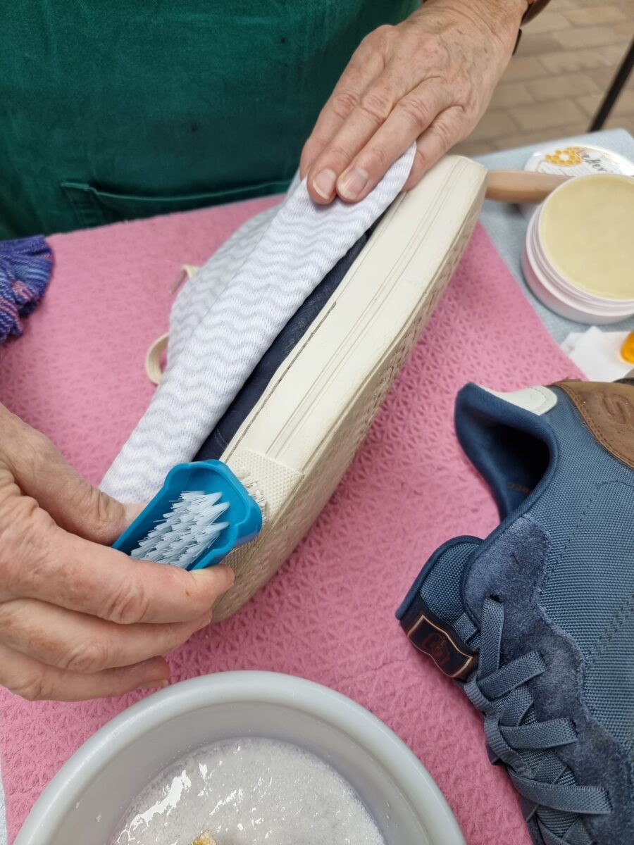 Außen sollte der Schuh leicht feucht abgewischt und nach dem Trocknen mit einer geeigneten Schuhcreme, eventuell auf Bienenwachsbasis, eingecremt werden. Danach poliert man ihn mit einer Glanzbürste „oder einer ausrangierten Wollsocke, was natürlich sehr nachhaltig ist“, so der Hinweis der Fachlehrkraft.