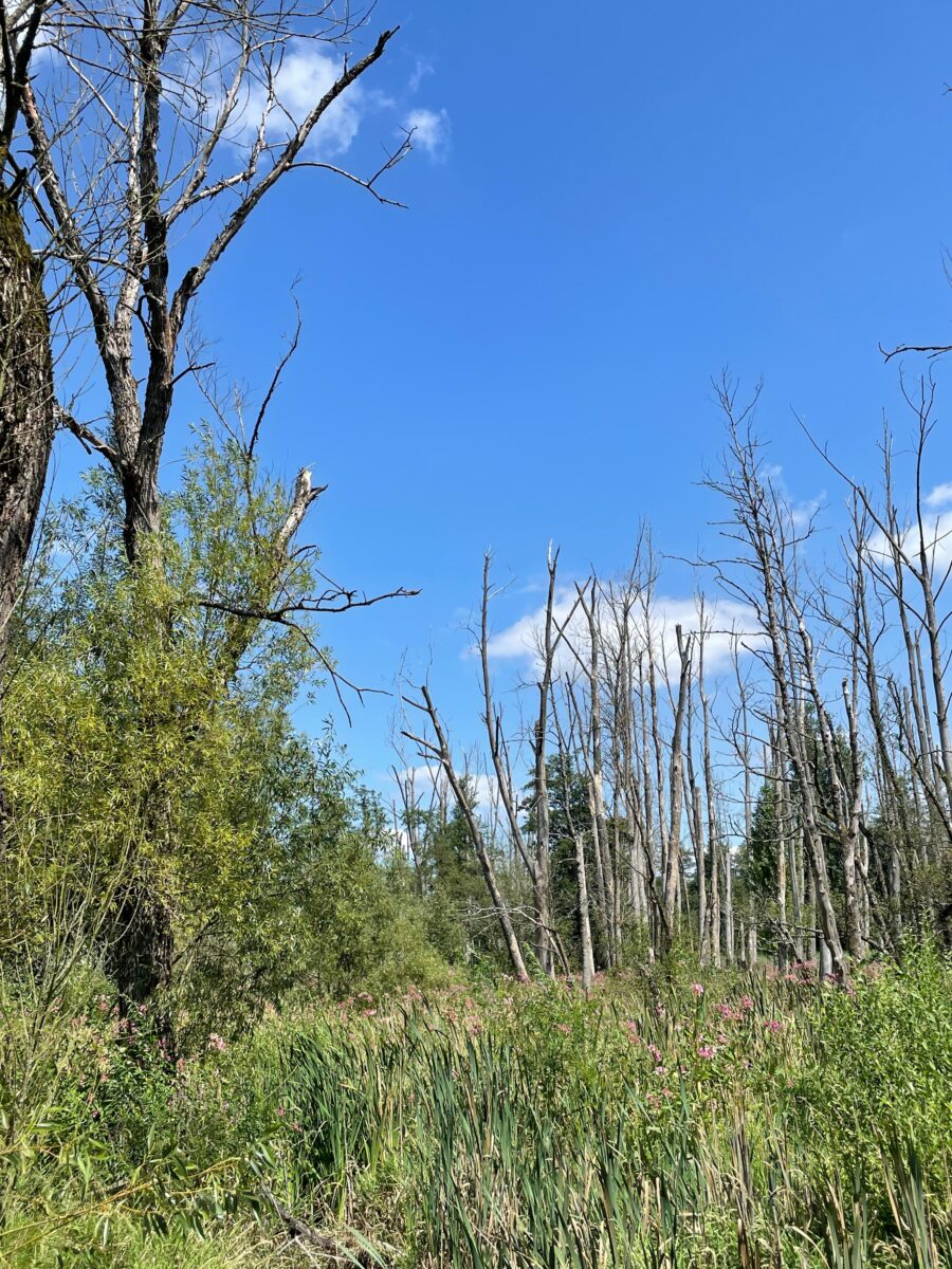 In unmittelbarer Stadtnähe gibt es ein ähnlich bizarre Fläche. Am Radweg an der Dr.-Kilian-Straße zur Kreuzung zum Schätzlerbad befindet sich ein Feuchtbiotop, genannt “Biberland”. Abgestorbene Pappeln ragen hellgrau aus dem Wasser. Der Blutweiderich blüht.