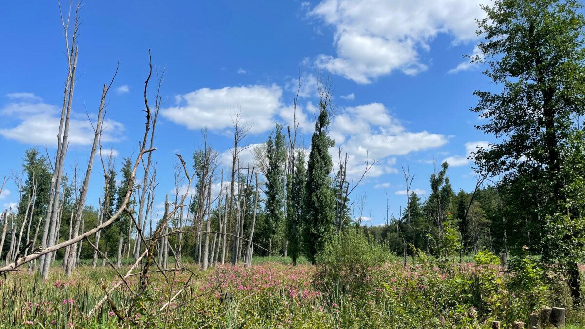 Das Ganze ist nicht ganz freiwillig entstanden. “Familie Biber” hat sich hier vor einigen Jahren angesiedelt. Die eifrigen Baumeister bauten ihre Dämme und fluteten das Gelände. Ursprünglich wuchsen hier Hybridpappeln, die in den 60er Jahren aufgrund ihrer schnellen Ertragsreiche angepflanzt wurden. Zudem standen auf dem Gelände einer früheren Baumschule schöne Ulmen, Linden und Kirschbäume.