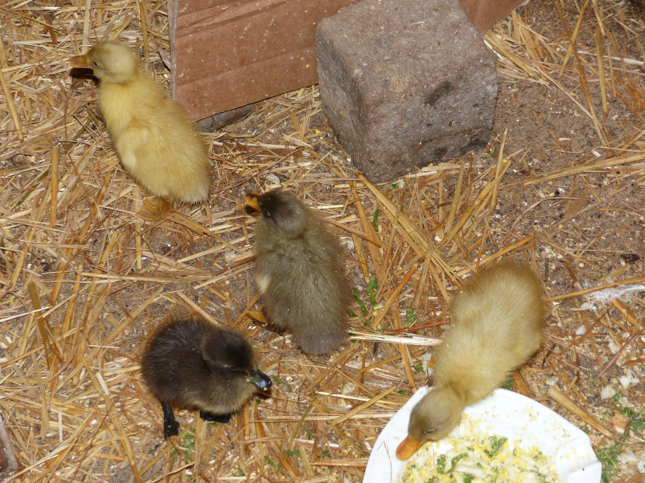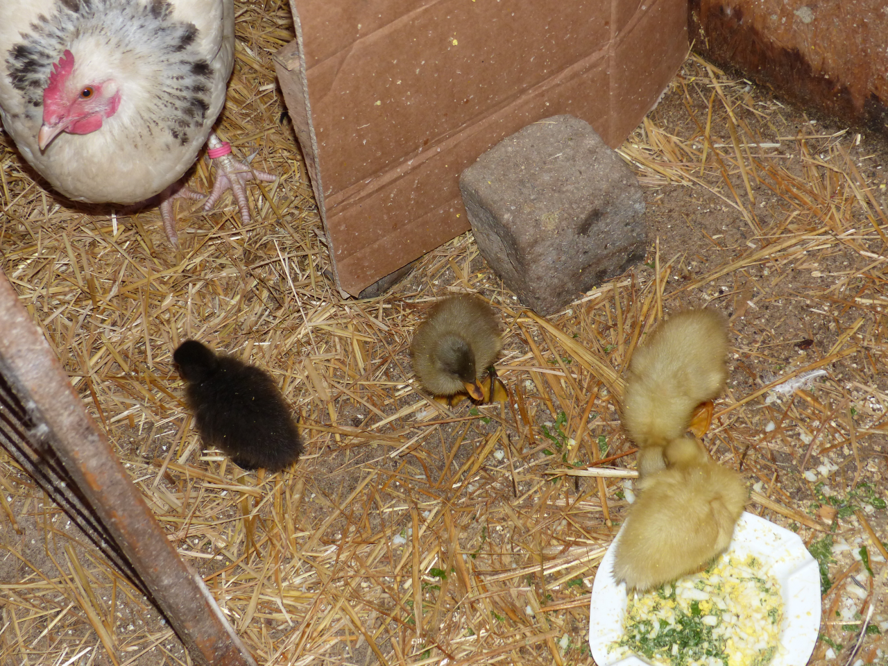 Eine Henne, eine Bruthenne sorgte dafür, dass junge Laufenten vor einigen Tagen das Licht der Welt erblicken. Fast 30 Tage brütete das Huhn sechs Eier aus und vier davon lieferten ein Ergebnis.