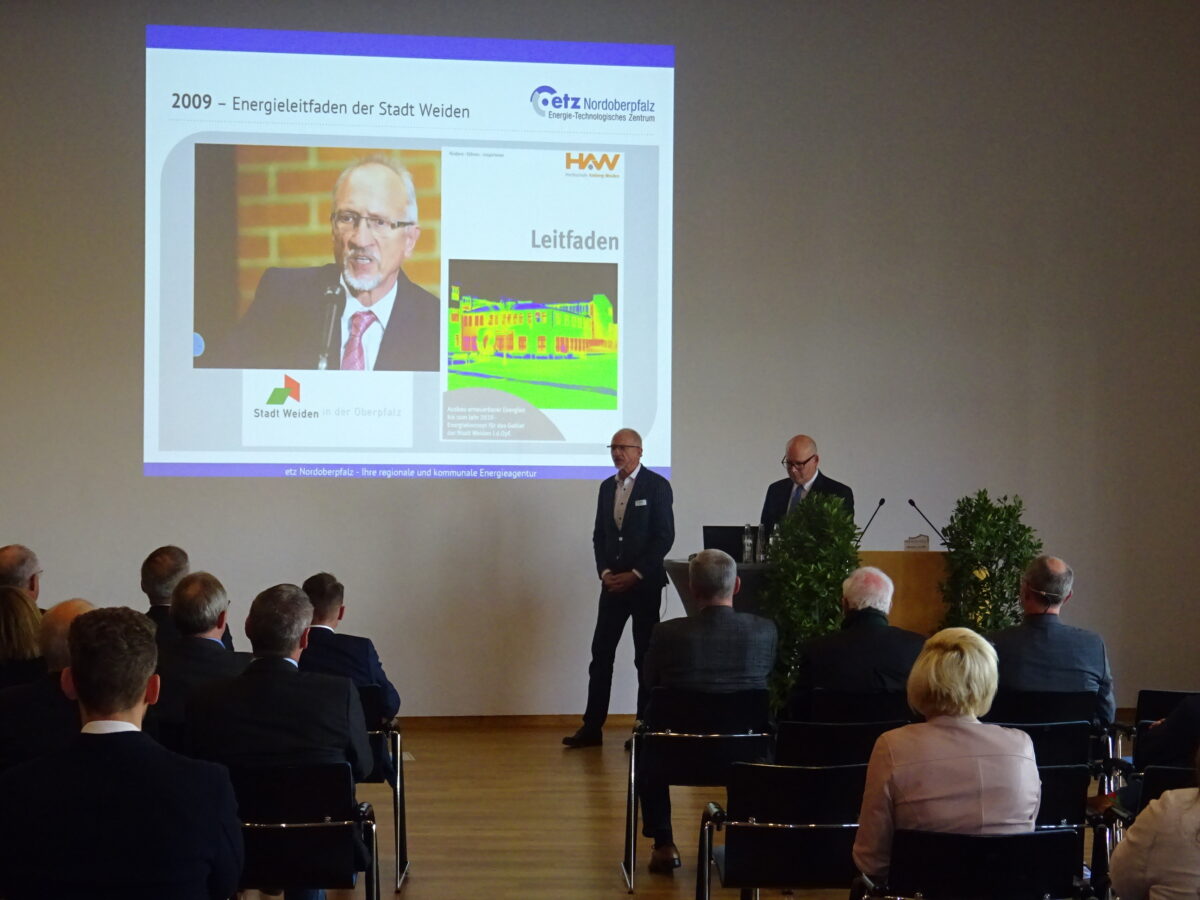 Der Beiratsvorsitzende Prof. Dr.-Ing. Magnus Jaeger und Matthias Rösch blickten gemeinsam auf die letzten zehn Jahre zurück und zeigten einige Meilensteine, wie die Gründungsvorbereitung und Gründung des etz Weiden, die spätere Umbenennung auf etz Nordoberpfalz und so manche Projekte wie das Energiecoaching für Gemeinden, Kooperation mit der Verbraucherzentrale Bayern Energieberatung, Elektromobilitätskonzept für die Stadt Weiden und das Projekt Windkümmerer auf.