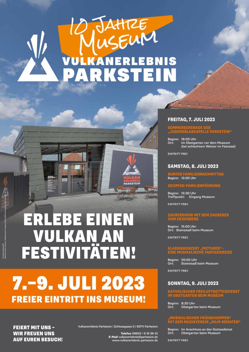 Vom 7. bis 9. Juli kann man in Parkstein einen Vulkan an Festivitäten erleben. Das Museum „Vulkanerlebnis Parkstein“ feiert in diesem Jahr sein zehnjähriges Bestehen und lädt alle Interessierten herzlich zu den Feierlichkeiten ein. Ein abwechslungsreiches Programm wartet an diesem besonderen Wochenende.