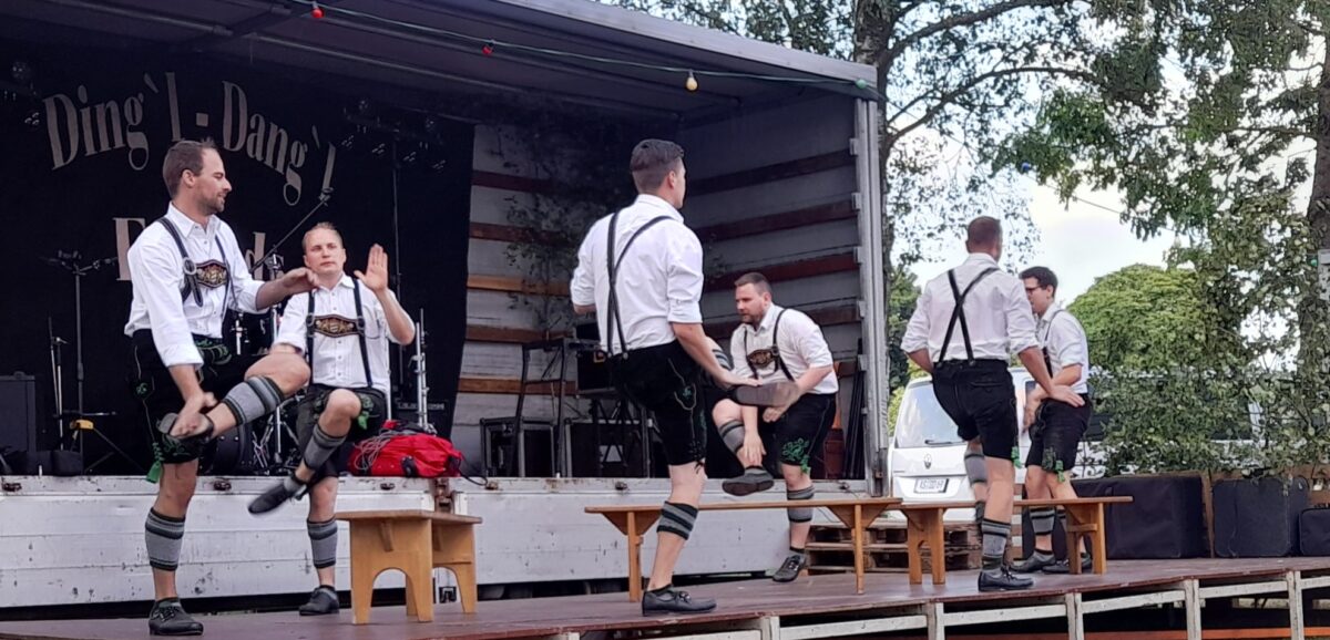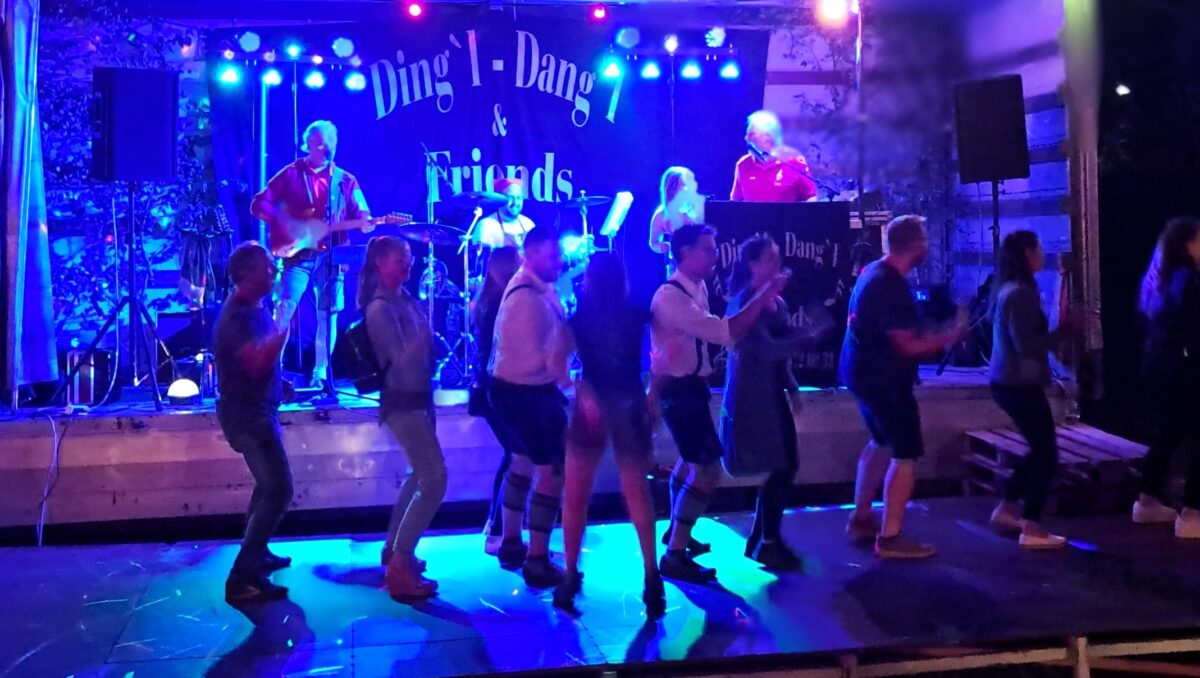 Der Hauptact des Abends, die Band Dingl-Dangl und Friends enterte die Bühne und sorgte mit zünftiger Kirwamusik, alten Rockhits und flotten Sprüchen für gute Stimmung, Bewegung und eine gut gefüllte Tanzfläche.