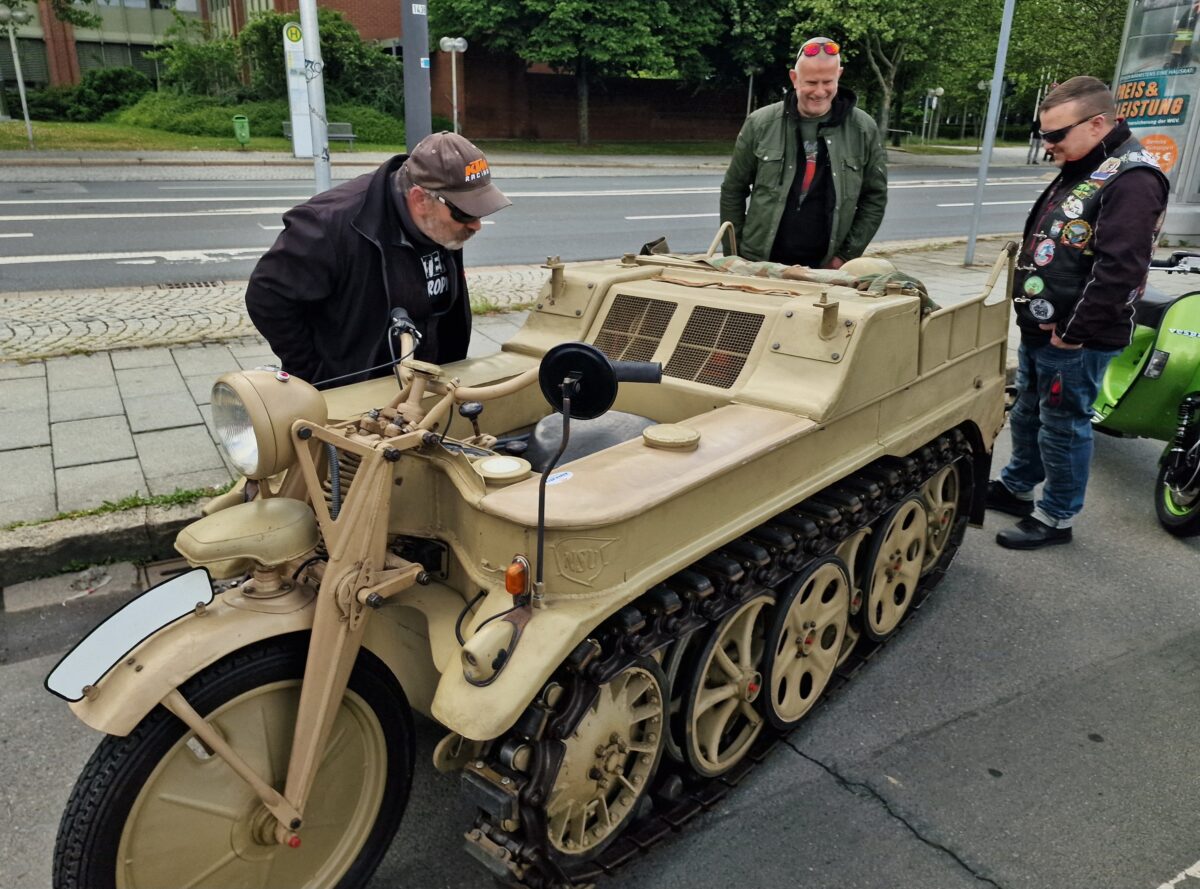 Grußworte überbrachten auch Vorsitzender Reinhard Meier und sein Ehrenvorsitzender Herbert Tischler. Mit der Startfahne in der Hand gab Meyer den offiziellen Startschuss. Punkt 11 Uhr setzte sich die bunte Fahrzeugkolonne in Bewegung, angeführt von einem Ferrari-Mondial 3,2 und auch ein NSU-Kettenkrad aus dem Jahr 1943 mit 36 PS war nur kurz dabei.