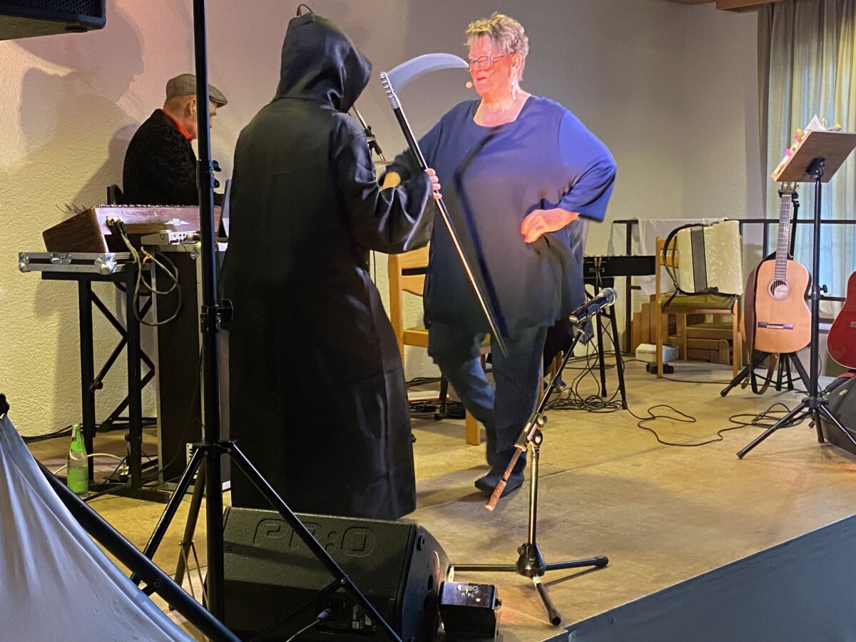 Einen „todsicheren Tipp“, wie man dem Tod ein Schnippchen schlagen kann, gab Karin Simon nach einigen Zugaben noch mit auf den Weg. „Wascht eure Füße nicht, denn mit schmutzigen Füßen lässt euch Petrus nicht durch die Himmelstür.“