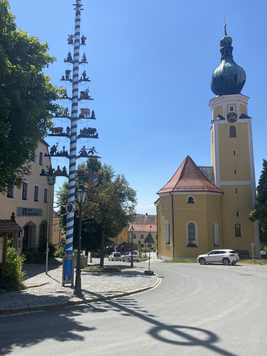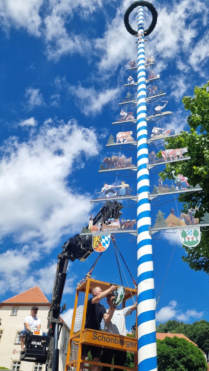 Aus Sicherheitsgründen musste der Zunftbaum im Marktplatz von Tännesberg vor geraumer Zeit abgebaut werden. Jetzt hat der OWV Tännesberg einen neuen, insgesamt 26 Meter hohen Baum wieder aufgestellt.