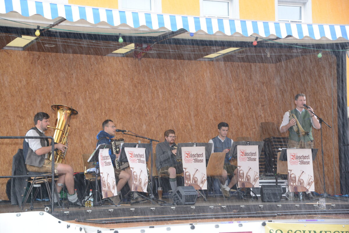 Doch immer wieder richteten sich die Blicke in Richtung Fahrenberg und Vohenstrauß, um sich auf eventuell ankommende Regengüsse einstellen zu können. Die kamen dann auch in zunehmendem Maße. Die Besucher suchten immer mehr die Plätze im „innersten Herzen“ der Zeltüberdachungen. Und so verkleinerte sich die Zahl der Besucher zusehends. Gegen 17 Uhr entschieden Bürgermeister Rainer Rewitzer und Kartellvorsitzender Thomas Wittmann die „Rüscherl Muse“ länger aufspielen zu lassen und dafür die „Pirker Blechmusi“ um Verständnis für eine Absage zu bitten.