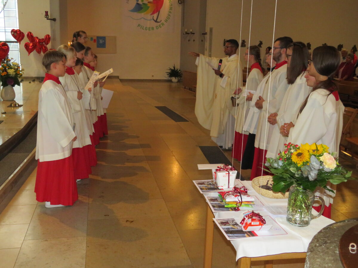 Mit der Neuaufnahme geht aber auch immer wieder ein Abschied einher. Mit kleinen Erinnerungsgeschenken verabschiedeten die Oberministranten Theresa und Bastian drei Ministrantinnen. Nach 13 Jahren scheiden Rebecca uns Svenja Witt und nach drei Jahren Emilia Staufer aus. Die Gemeinschaft der Ministranten der Pfarrei besteht jetzt aus 69 Kinder, Jugendliche und junge Erwachsene. Luis Denz, Christa Bauer–Denz, Margret Rauch und Klaus Neumann umrahmten den Gottesdienst musikalisch.