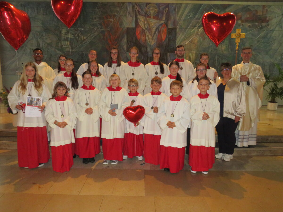 Die Gruppenleiterinnen Vicky und Sara bereiteten die Kinder für den Dienst am Altar vor. Nach der Predigt baten sie Pfarrer Thomas Kopp und Pfarrvikar Justin Kishimbe, die Mädchen und Buben in die Gemeinschaft der Ministranten aufzunehmen. Mit einem roten Luftballonherz zeigten die Neuen, dass Jesus ihr Vorbild ist.