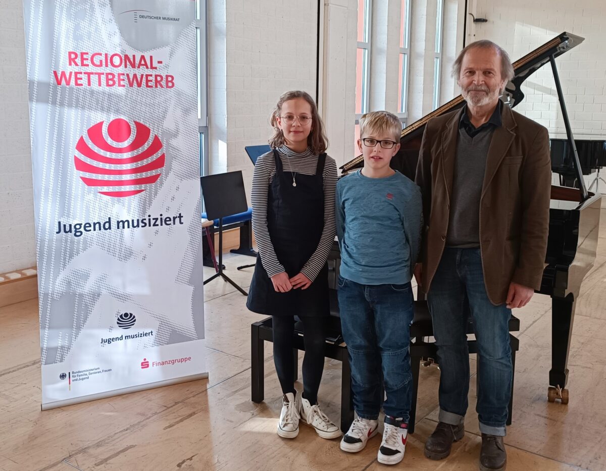 Lehrer Karl-Heinz Kuhl freut sich mit seinen beiden Schülern über den großartigen Erfolg. Dafür ist viel Fleiß und Anstrengungen nötig. Auch Extra-Proben in den Weihnachtsferien trugen dazu bei. Pauline und Anton werden beim Preisträgerkonzert am Sonntag, 4. Februar, um 16.00 Uhr in der Berufsfachschule für Musik in Sulzbach-Rosenberg zu hören sein.