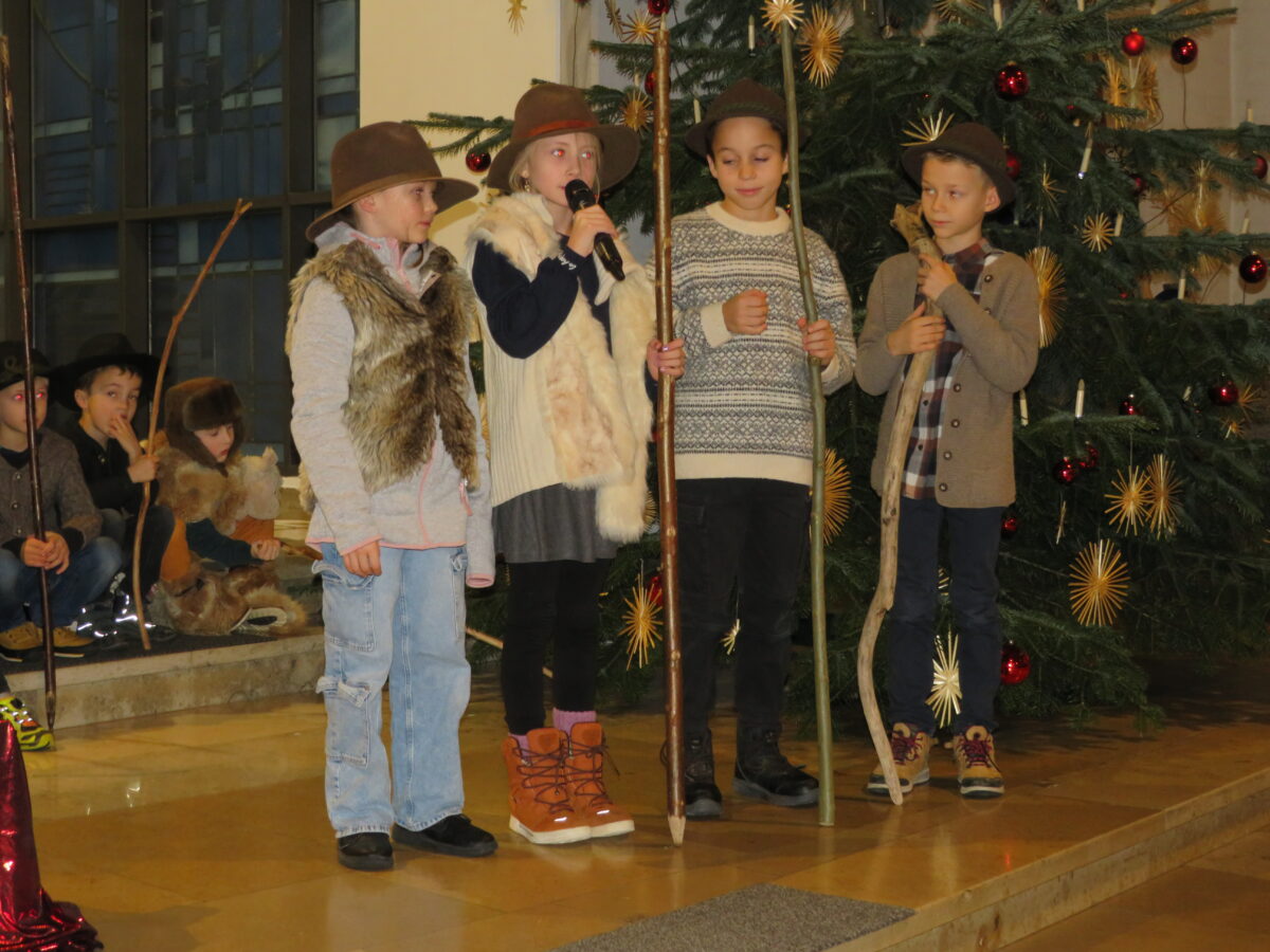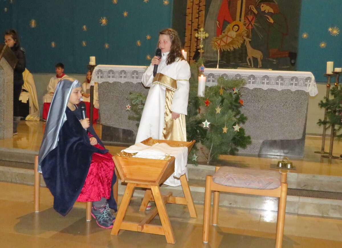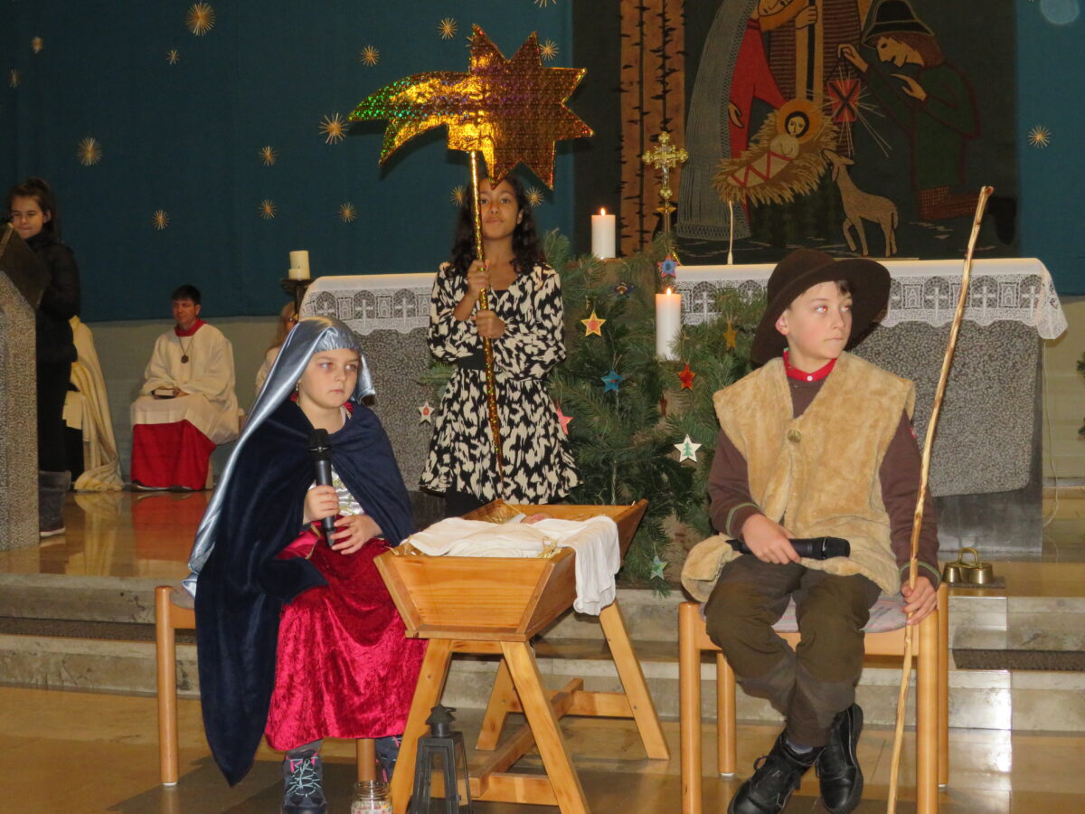 Pfarrer Thomas Kopp begrüßte die Kinder, Eltern, Geschwister und alle Gläubigen. Er sagte, dass das wichtigste Geschenk für die Christen an Weihnachten das Kind in er Krippe ist. Von der Reise von Josef und Maria nach Bethlehem, über die Herbergssuche bis zur Geburt im Stall spielten die Kinder die Geschichte eindrucksvoll nach. Die Verkündigung der Engel an die Hirten und deren Anbetung des Jesuskindes in der Krippe zeigte den Gläubigen den Kern der Weihnachtsbotschaft. Gemeinsam betete die Kinder in den Fürbitten um Frieden in der Welt und für alle benachteiligten Menschen. Gemeinsam wurde zum Abschluss das Weihnachtslied „Stille Nacht, heilige Nacht“ gesungen.
