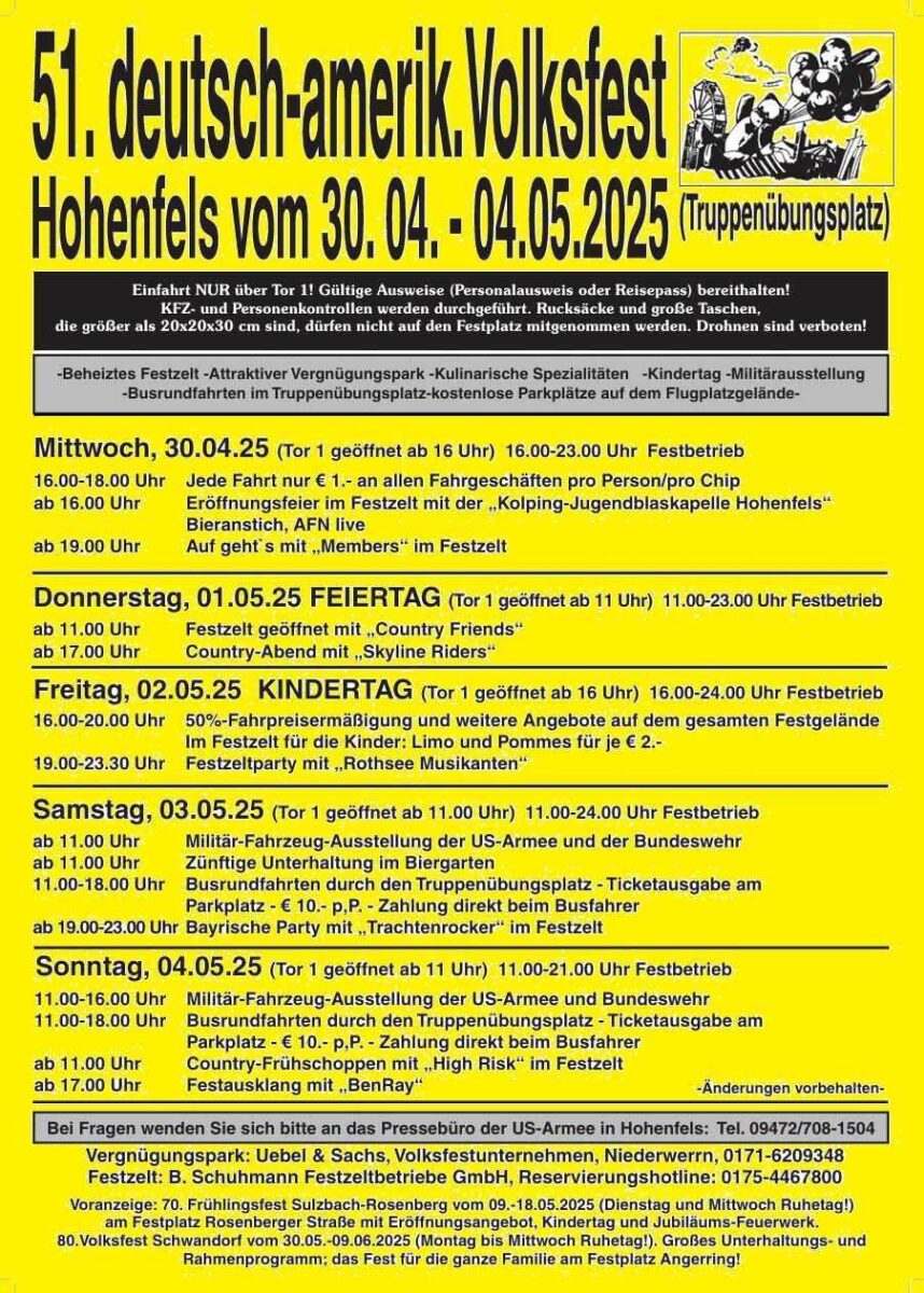 Vom 30. April bis zum 4. Mai 2025 wird auf dem US-Truppenübungsplatz in Hohenfels das 51. Deutsch-Amerikanische Volksfest gefeiert. Dieses traditionelle Event, das jährlich Tausende von Besuchern anzieht, steht ganz im Zeichen der Deutsch-Amerikanischen Freundschaft und bietet ein umfangreiches Programm, das alle Altersgruppen anspricht.