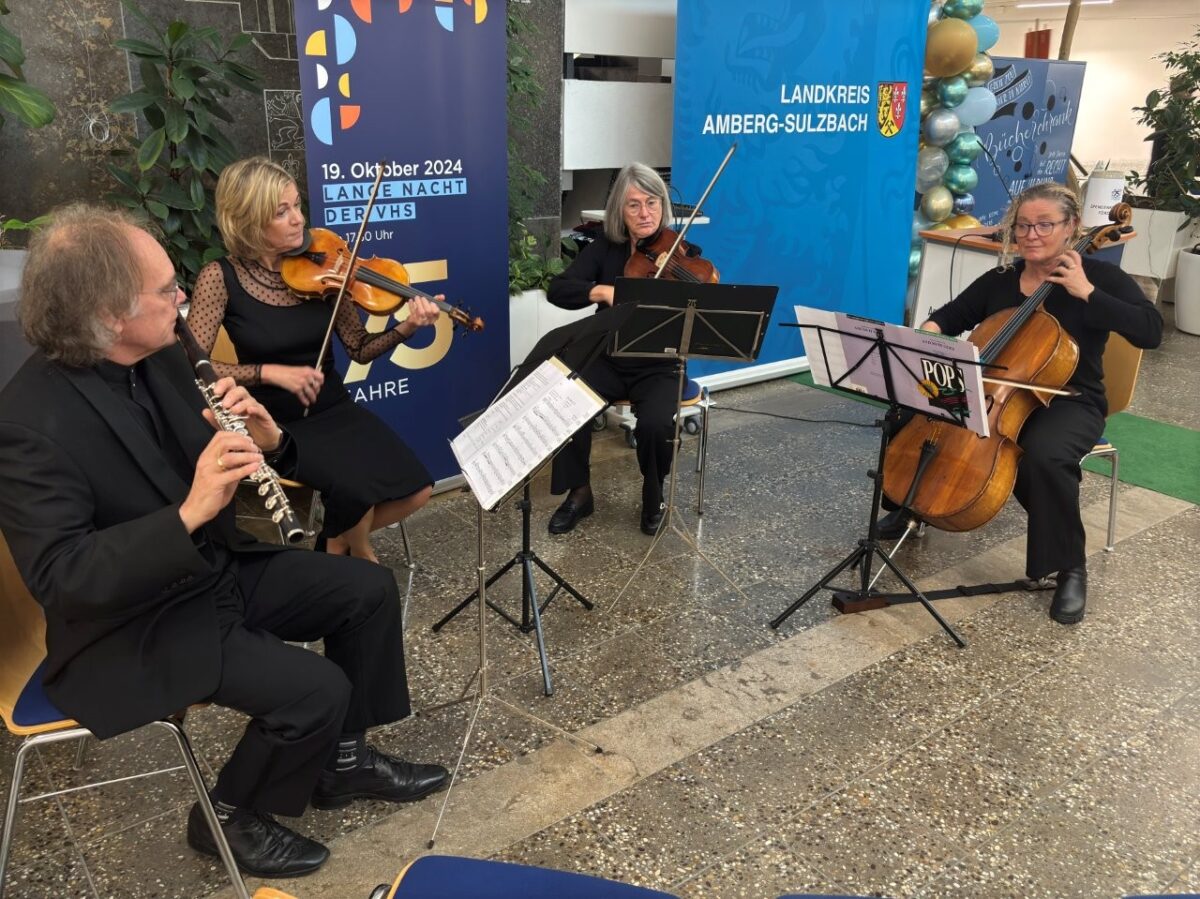 Claudia Mai führte durch die kurzweilige Chronik der vhs seit 1949, von Mitgliedern des Teams in originellen Spielszenen veranschaulicht. Altbürgermeister Gerd Geismann steuerte die wichtigsten Texte übers Mikrofon bei, ein Kammermusik-Quartett unter Leitung von Dieter Müller bot hochklassige, aber trotzdem originelle Stücke. Der Bogen spannte sich von den Anfängen des “Volksbildungsvereins” in der Spitalgasse, dann in der Unteren Bachgasse, später im Schloss. Auch das Literaturarchiv in Sulzbach-Rosenberg wurde für die Bildungsarbeit genutzt, lange residierte die vhs auch im Gebäude Luitpoldplatz 23, bevor sie im ehemaligen Landratsamt, dem LCC, ankam.