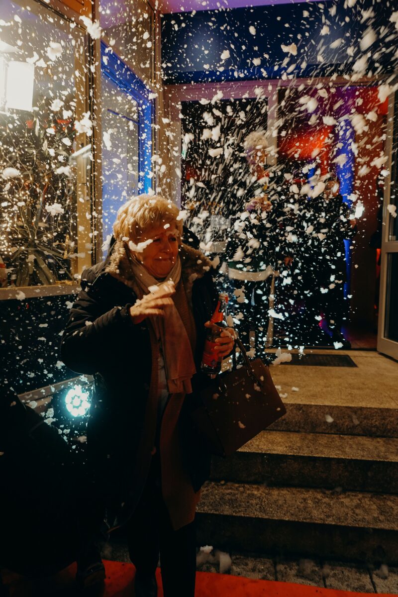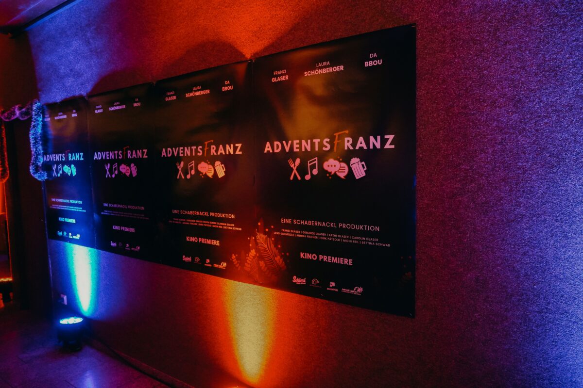 Vor dem komplett in blau und rot gehüllten Kino war einiges geboten: Weihnachts-Burger, Lebkuchen und Glühwein, ein riesiger Schneemann und natürlich ein roter Teppich, auf dem sich die Gäste im Kunstschnee-Gestöber fotografieren ließen. Darunter waren mit Konditormeisterin Laura Schönberger, Rapper Bbou und der Comedy-Band Barbari Bavarii nicht nur die Stargäste der gezeigten Folgen, sondern auch Lokalprominenz und Gäste aus vergangenen Adventsfranz-Staffeln, beispielsweise Sängerin Tina Trummer, Kult-Friseur Benny Dietl oder Gstanzlsänger Lucky.