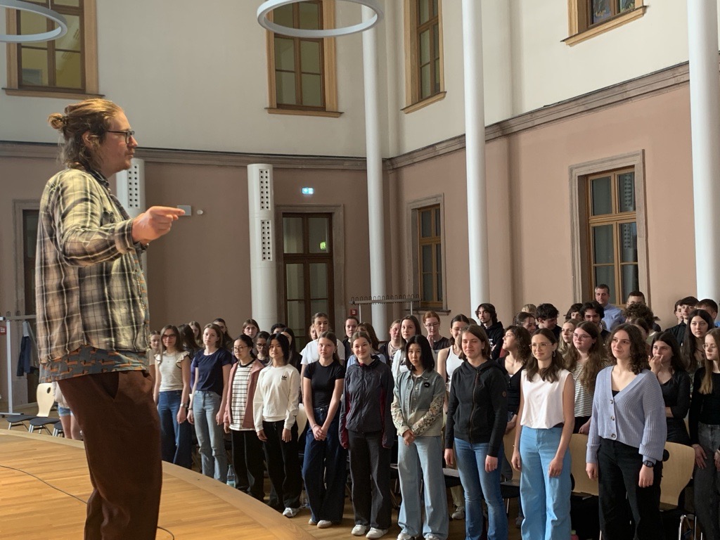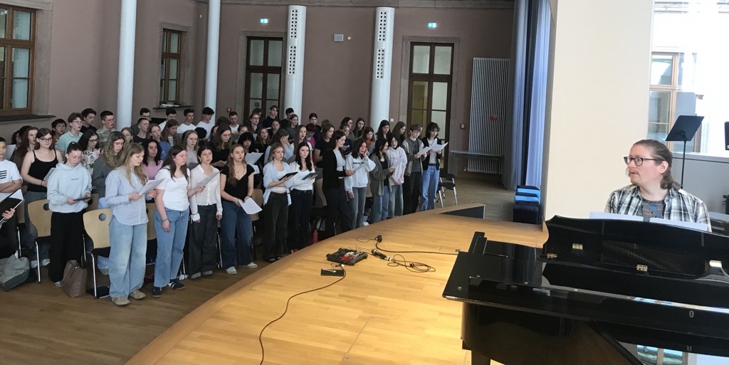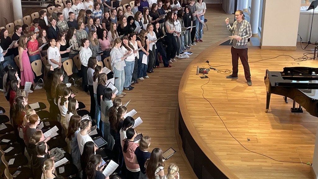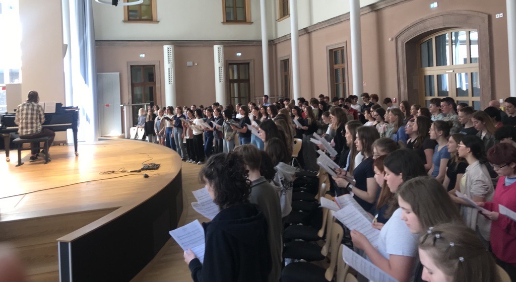 Die vier Chorleiter der beteiligten Schulen – Franz Hanauska (Dr.-Johanna-Decker-Gymnasium), Christine Uhle (Erasmus-Gymnasium), Anja Onasch (Gregor-Mendel-Gymnasium) und Michaela Treese (Max-Reger-Gymnasium) – hatten ihre Schützlinge auf die beiden Workshoptage mit Andreas Kuch bestens vorbereitet. Im Multifunktionsraum des Max-Reger-Gymnasiums waren alle Jugendlichen mit großem Engagement erstmals zusammengekommen, um gemeinsam zu singen.