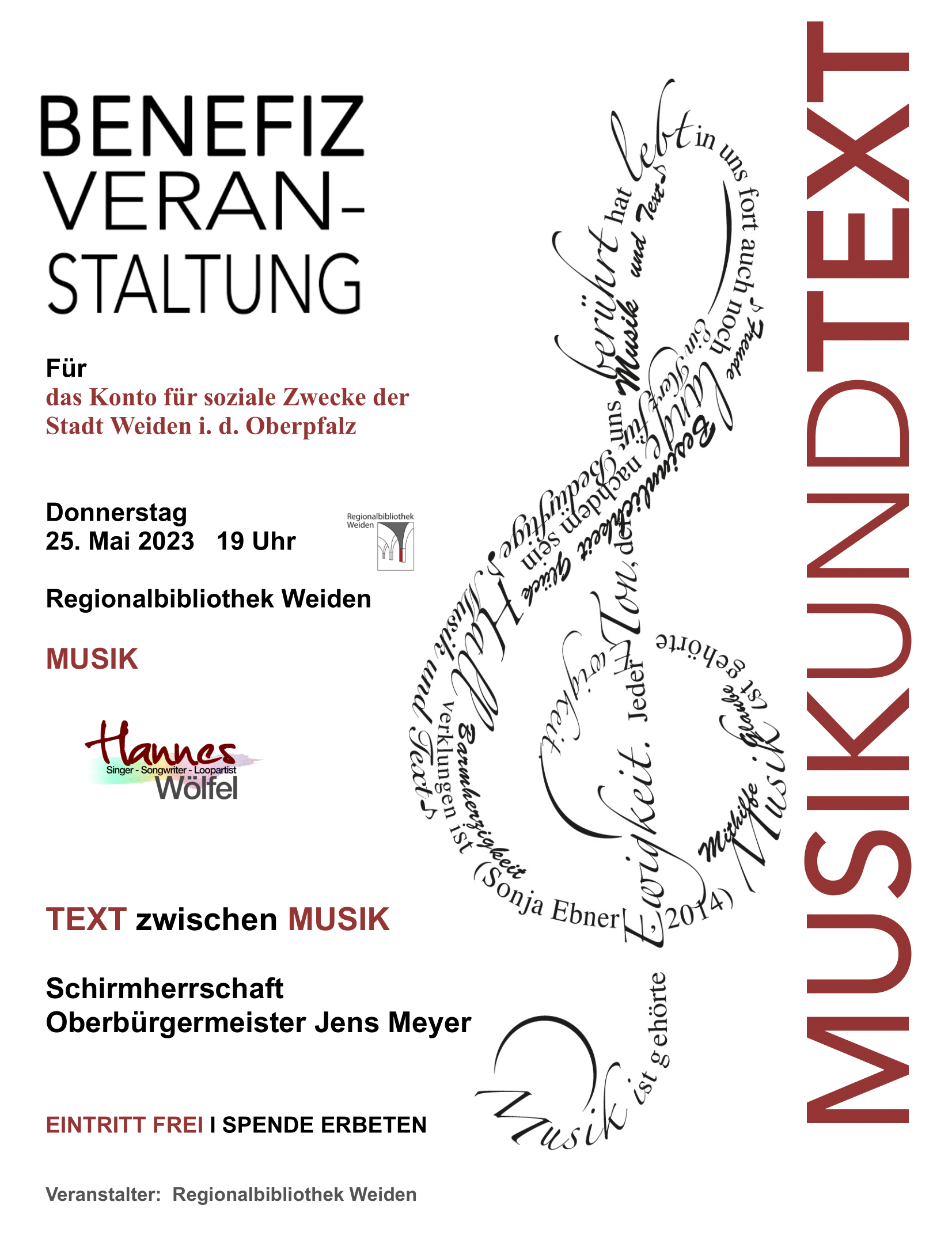 Begleitet von Textbeiträgen, übernimmt der Sänger Hannes Wölfel die musikalische Gestaltung. In Anlehnung an den 150. Geburtstag des Weidener Komponisten Max Reger werden Texte von Liedern, die das “Geburtstagskind” komponiert hat, gelesen. Die Schirmherrschaft übernimmt Oberbürgermeister Jens Meyer.